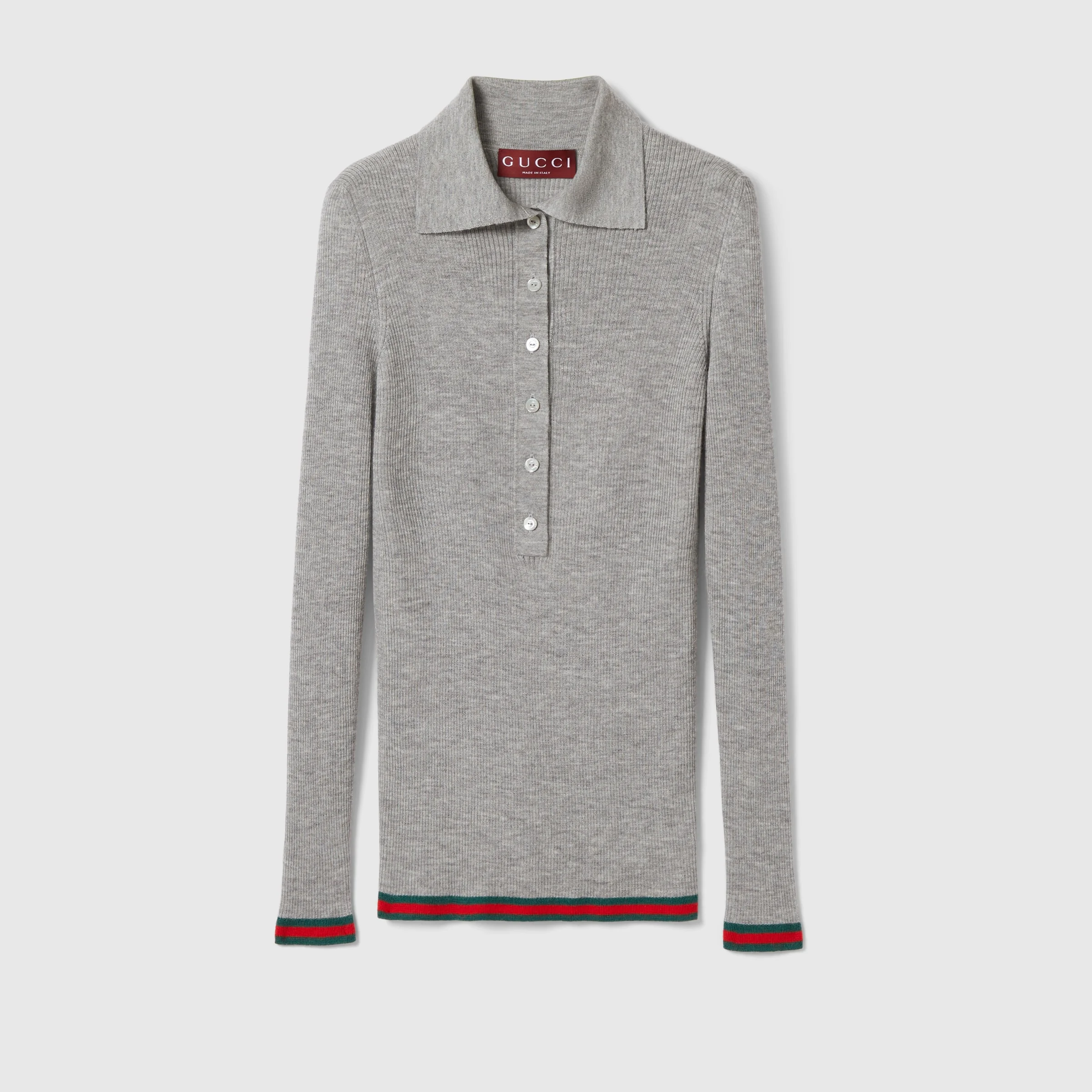 Gucci's House codes continue to evolve for the Cruise 2025 collection across relaxed jersey pieces. Crafted from an extra fine cashmere and silk rib, this polo top reveals a Gucci intarsia and reveals a green and red Web trim across the cuffs and hem. - Grey extrafine cashmere and silk rib - Gucci intarsia - Polo collar - Long sleeves - Web trim - Button closure - Length: 25.2"; Shoulder: 11"; Half waist/chest: 12.6"; Sleeves length: 25.2" based on a size S - Made in Italy - The product shown in this image is a size small