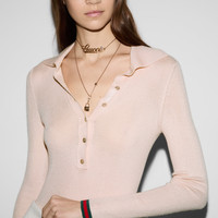 Gucci's House codes continue to evolve for the new season across relaxed jersey pieces. Crafted from an extra fine cashmere and silk rib, this polo top reveals a Gucci intarsia and reveals a green and red Web trim across the cuffs and hem. - Pale pink extrafine cashmere and silk rib - Gucci intarsia - Polo collar - Long sleeves - Web trim - Button closure - Length: 25.2"; Shoulder: 11"; Half waist/chest: 12.6"; Sleeves length: 25.2" based on a size S - Made in Italy - The product shown in this image is a size small