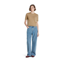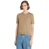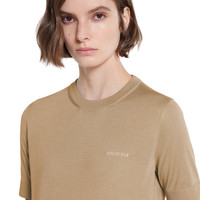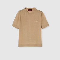 For the Pre-Fall 2025 collection, the theme of casual grandeur includes sophisticated knitwear, such as this crewneck top in a fine cashmere and silk blend. A delicate Gucci intarsia completes the silhouette. - Light camel fine cashmere and silk - Gucci intarsia - Crewneck - Short sleeves - Rib trim - Made in Italy
