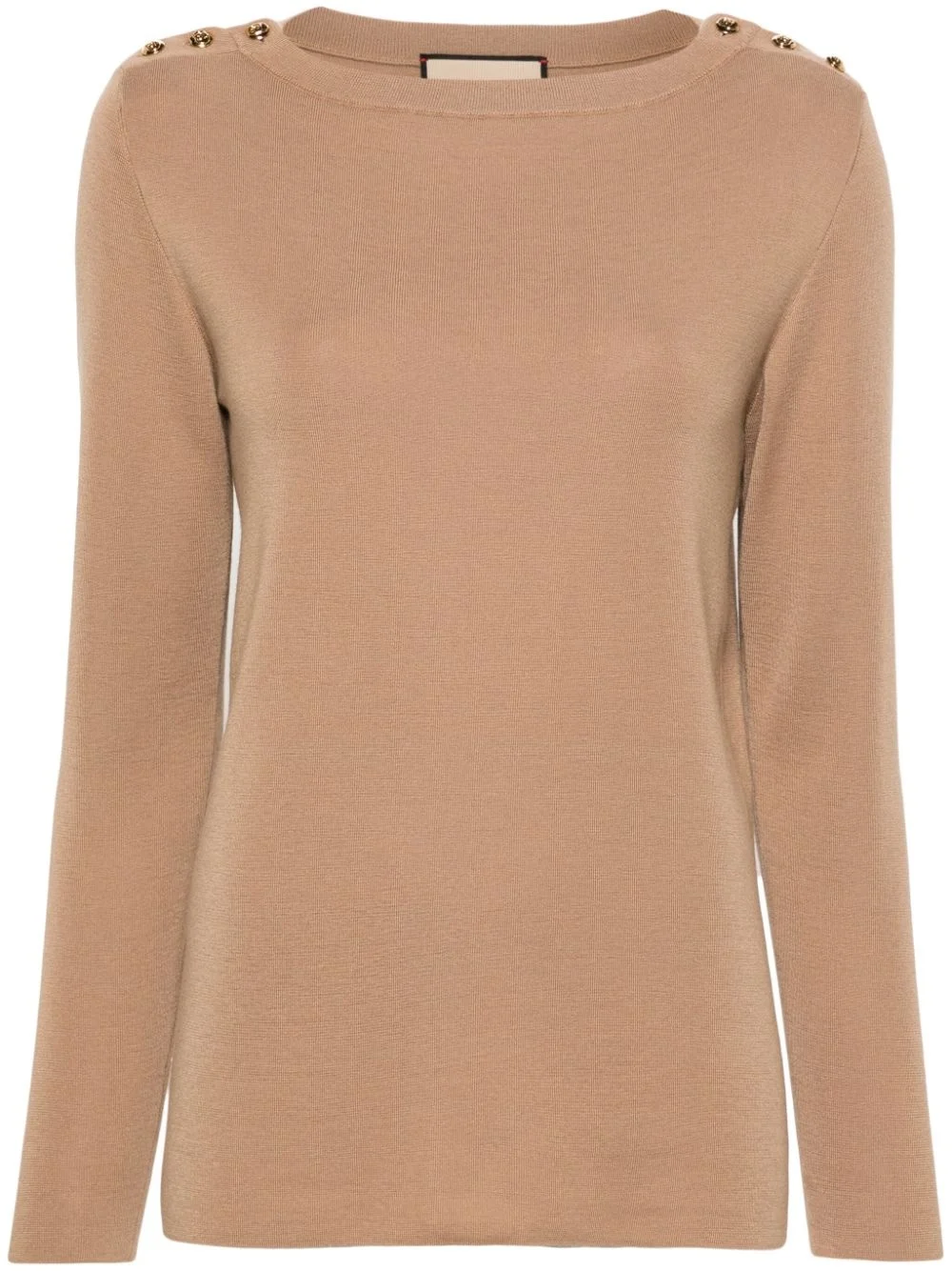 shoulder-button cashmere jumper Gucci’s collections are filled with pieces that imbue high-quality Italian craftsmanship and heritage. From SS23, this jumper is presented in fine knitted cashmere for a classic and traditional approach. Highlights - Brown - Cashmere - Fine knit - Signature interlocking g logo - Logo-embossed buttons - Crew neck - Button fastening at the shoulder - Long sleeves - Straight hem Made in Italy Composition Cashmere 100% SIZE & FIT Model measurements Height 5 ft 9 in(1.76 m) Bust/Chest 31.88 in(81 cm) Hips 35.43 in(90 cm) Waist 24.8 in(63 cm) FittingInformation Designed for a relaxed fit, this piece allows for comfort and movement when worn Made with a midweight knit, this piece offers some stretch This piece fits true to size – take your usual size Washing instructions Dry Clean Only