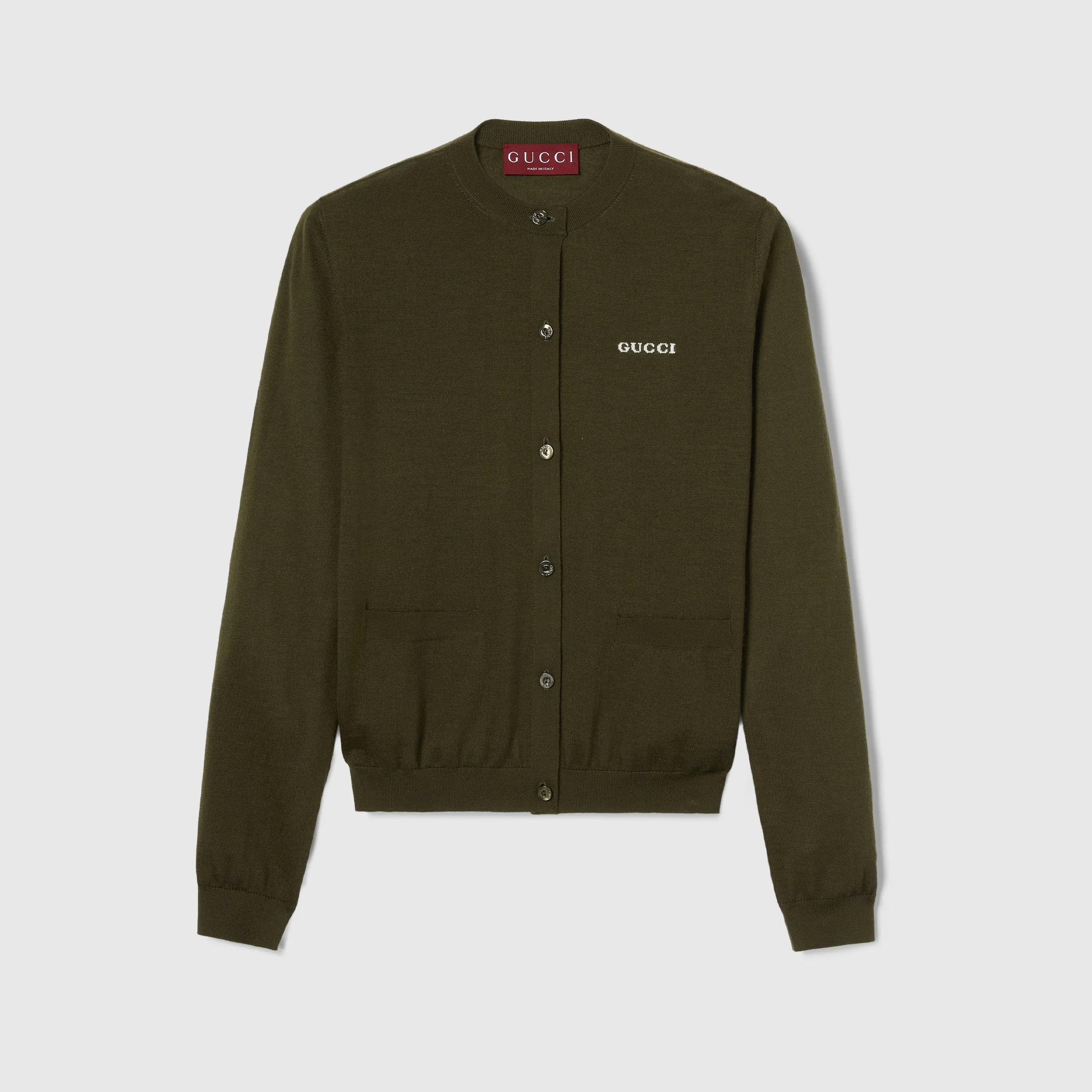 In the Spring Summer 2025 collection, the theme of casual grandeur includes sophisticated knitwear, such as this crewneck cardigan. - Forest green cashmere silk - Gucci intarsia - Crewneck - Long sleeves - Two front pockets - Button closure - Length: 21.7" based on a size small - Made in Italy - The product shown in the image is a size small
