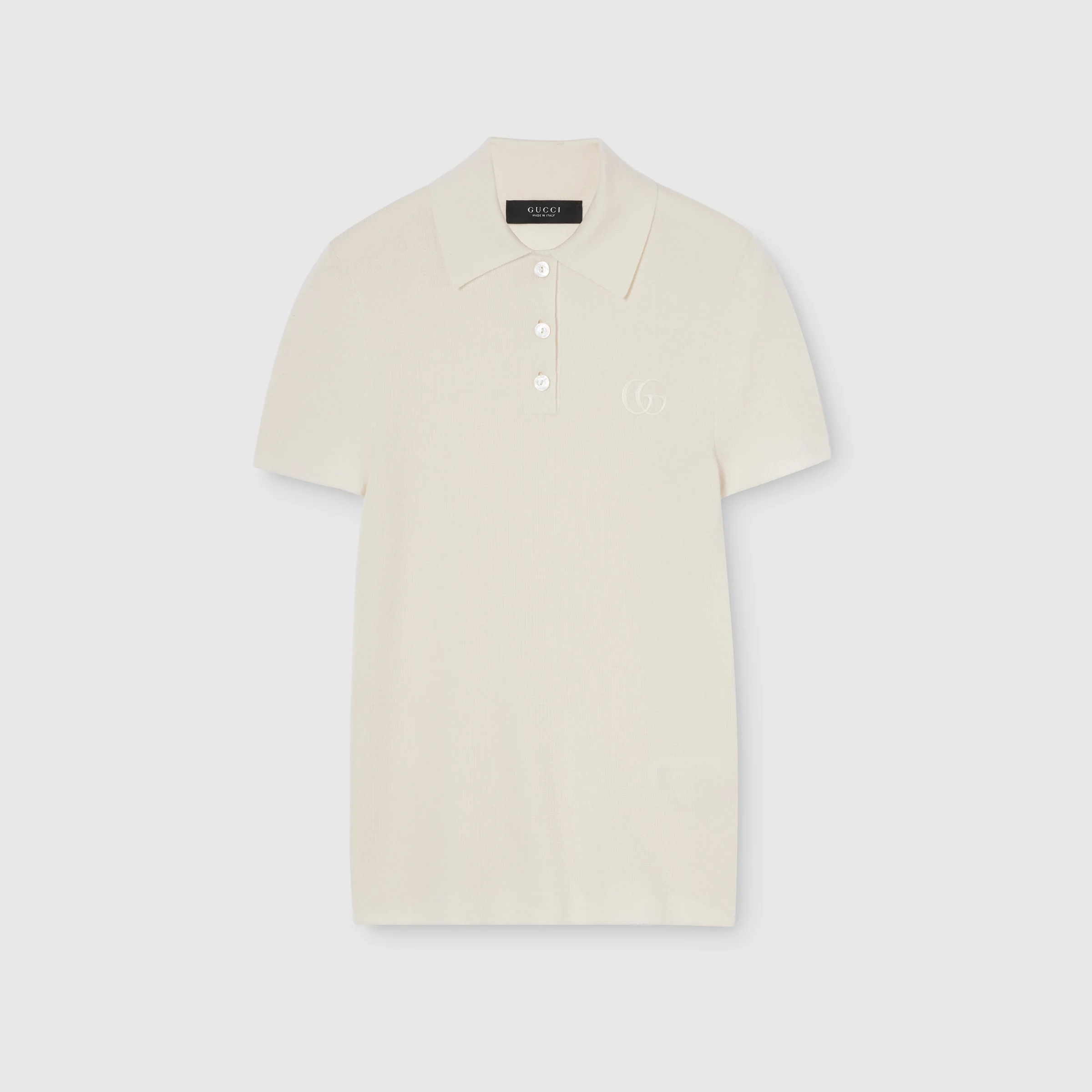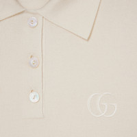 Introducing Spring Summer 2026. This style is inspired by the "La Gallerista" look of La Famiglia. The collection reinterprets the House’s codes through singular personalities and distinctive aesthetic attitudes. Crafted from fine cashmere silk, this polo shirt is enriched with a Double G embroidery. - White fine cashmere silk - Rib trim - Double G embroidery - Polo collar - Short sleeves - Length: 23.4", based on a size XS - Made in Italy - Fabric: 70% Cashmere, 30% Silk - Trimming: 65% Cashmere, 26% Silk, 7% Polyamide, 2% Elastane - Embroidery: 100% Polyester