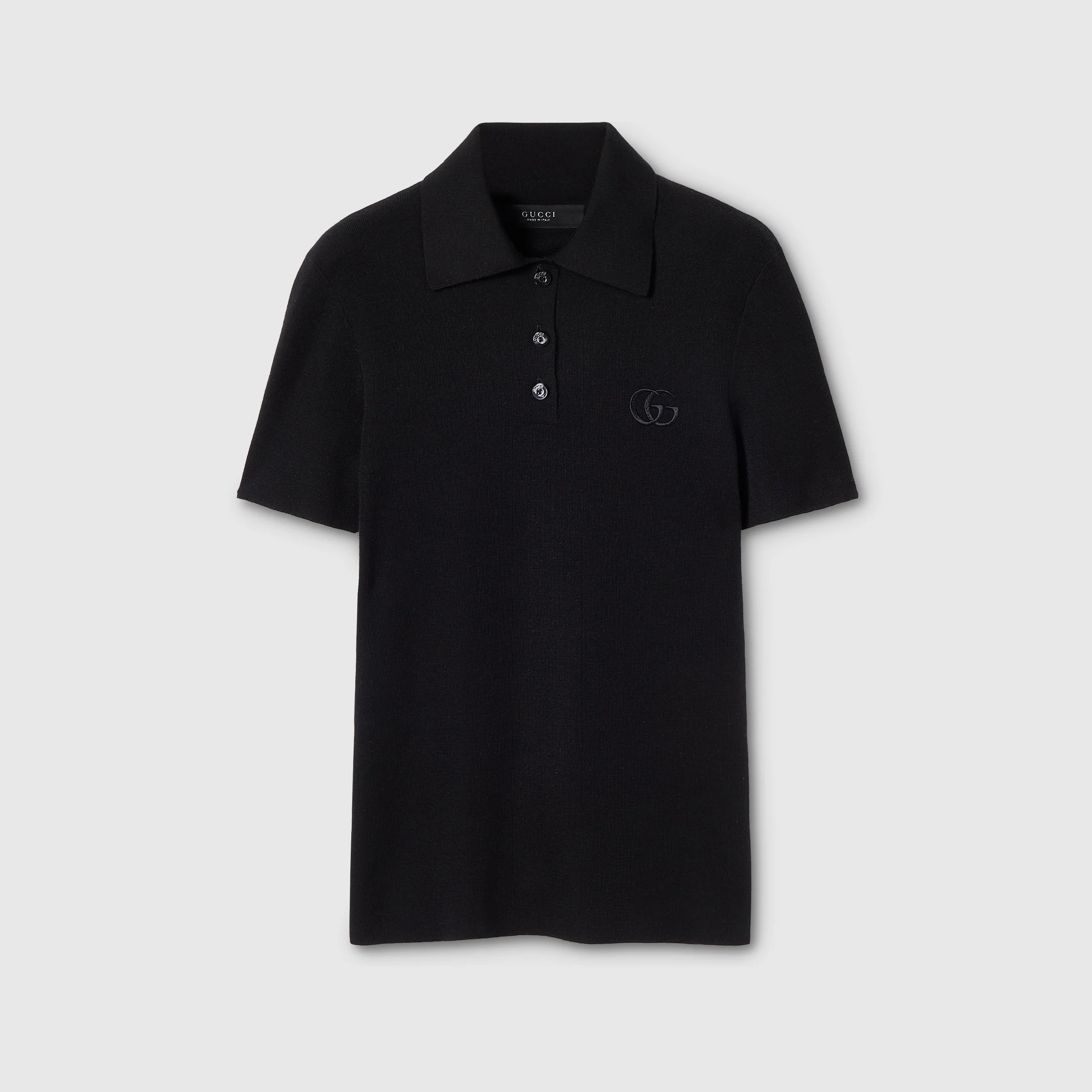Introducing Spring Summer 2026. This style is inspired by the "La Gallerista" look of La Famiglia. The collection reinterprets the House’s codes through singular personalities and distinctive aesthetic attitudes. Crafted from fine cashmere silk, this polo shirt is enriched with a Double G embroidery. - Black fine cashmere silk - Rib trim - Double G embroidery - Polo collar - Short sleeves - Length: 23.4", based on a size XS - Made in Italy - Fabric: 70% Cashmere, 30% Silk - Trimming: 65% Cashmere, 26% Silk, 7% Polyamide, 2% Elastane - Embroidery: 100% Polyester