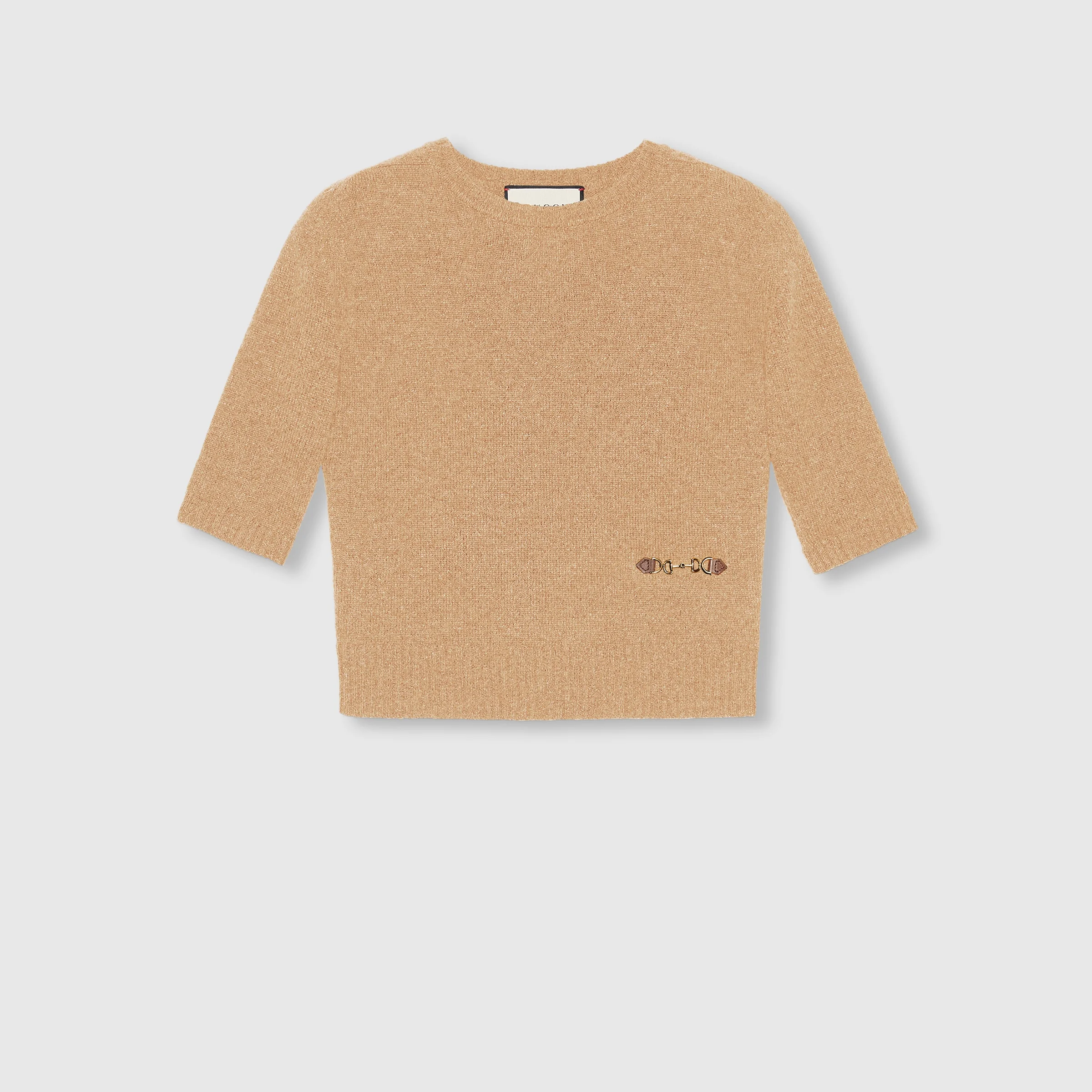 Classic knitwear designs in sophisticated color schemes are enriched by refined details and emblematic House codes. Crafted from beige soft cashmere, this short-sleeved crewneck top features the gold-toned metal Horsebit—a notable Gucci symbol borrowed from the equestrian world—paired with subtle leather details. - Beige cashmere - Crewneck - Horsebit with leather details - Short sleeves - Rib trims - Length: 20.4", based on a size small - Made in Italy