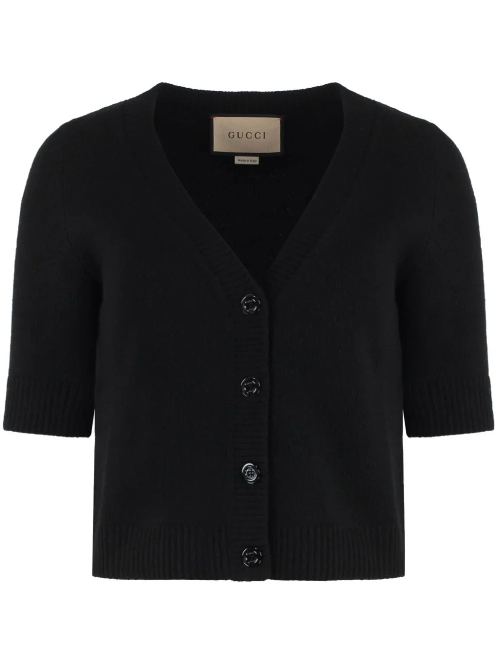 short-sleeve cashmere cardigan Knitted from cashmere, this short-sleeve Gucci cardigan features a timeless V-neck silhouette. It's adorned with a subtle intarsia-knit logo on the back, allowing the premium craftsmanship to shine. Highlights - Black - Cashmere - V-neck - Short sleeves - Front button fastening - Intarsia-knit logo - Straight hem Made in Italy Composition Cashmere 100% Washing instructions Read Manufacturer Guidelines