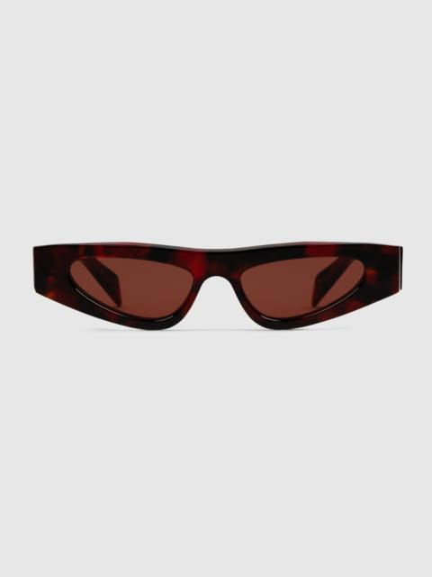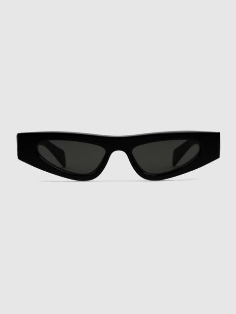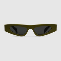 The eyewear collection puts a twist on the iconic Gucci signature silhouettes. In this cat-eye frame sunglasses, a subtle Gucci logo defines the temples, drawing inspirations from the House motif. - Shiny olive green acetate frame - Shiny olive green acetate temples with Gucci logo - Solid grey lens - 100% UVA/UVB protection - GG1779S - Temple length: 5.7"; Lens height: 1"; Nose bridge length: 0.7" - Frame height: 1.3"; Frame width: 5.7" - The Rosso Ancora packaging, a distinctive color chosen by Creative Director Sabato De Sarno to mark the beginning of Gucci's new creative chapter, includes a vinyl case and satin pouch.