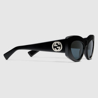 The Cruise 2025 eyewear collection blends a sleek silhouette and signature motifs in an elevated design. These sunglasses feature a cat-eye frame and Interlocking G detail on the temples. - Shiny black acetate frame - Shiny black acetate temples with Interlocking G detail - Solid smoke lens - 100% UVA/UVB protection - GG1843S - Temple length: 5.5"; Lens height: 2.2"; Nose bridge length: 0.8" - Frame height: 1.9"; Frame width: 5.7"; Hinge to hinge: 5" - Made in Italy - The eyewear case in the House’s signature Gucci Rosso Ancora red hue is complete with a magnetic closure and white interior.