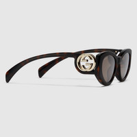 For the Pre-Fall 2024 collection, archival elements are reinterpreted with a contemporary touch. Here, a tortoiseshell cat-eye injection frame is decorated with an Interlocking G cut-out detail on the temples. - Shiny tortoiseshell injection frame - Shiny tortoiseshell temples with Interlocking G cut-out detail - Solid brown lens - 100% UVA/UVB protection - GG1691S - Temple length: 5.7"; Lens height: 1.5", Nose bridge length: 0.7" - Frame height 1.8"; Frame width 5.6" - Made in Japan - The glasses will arrive in a velvet case, available in a range of six jewel-toned colors, and paired with a coordinating satin lining. The case color will be individually selected for each pair of glasses, and comes with a matching satin flannel pouch and ivory microfiber cloth.