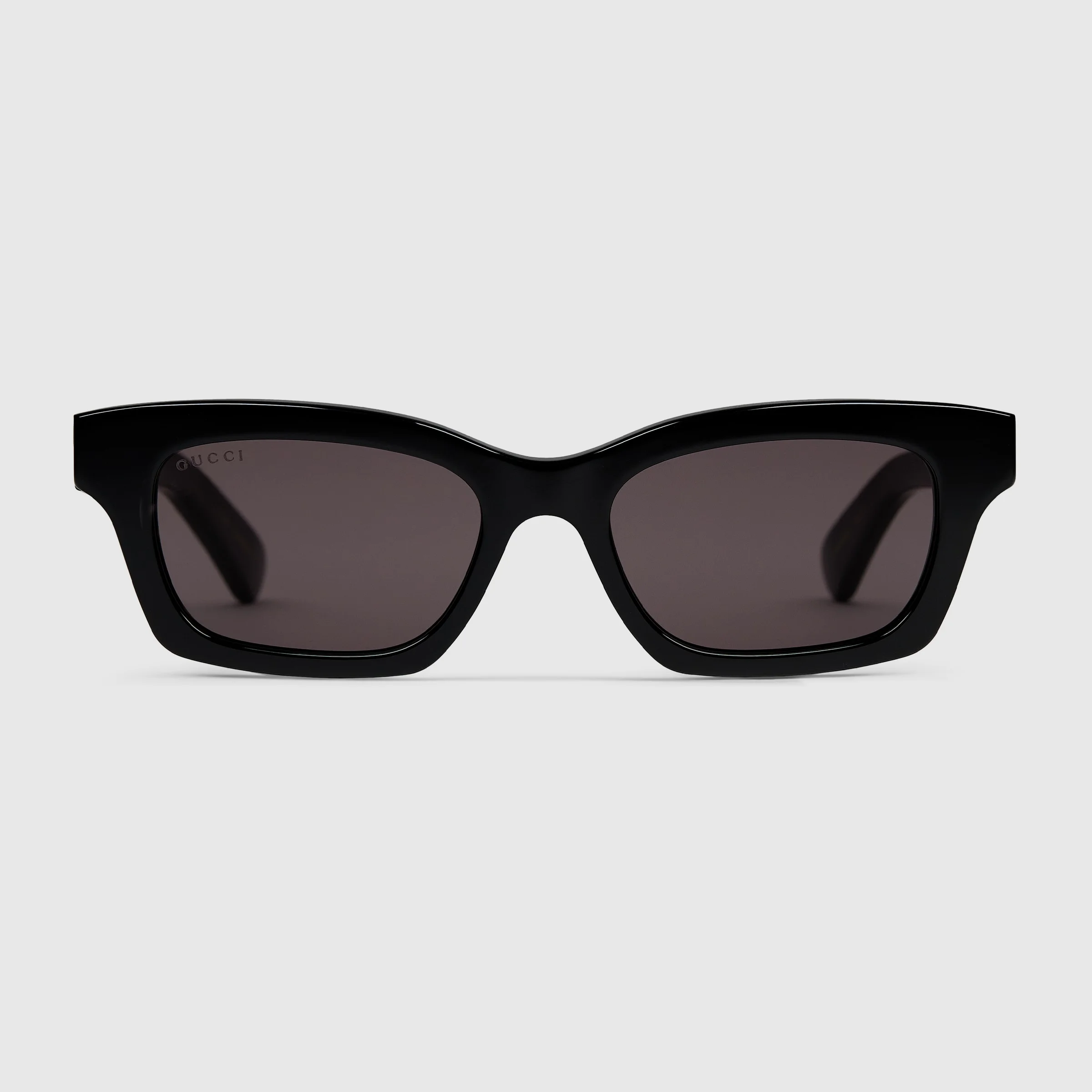 The Cruise 2025 eyewear collection blends an essential silhouette with signature motifs. These cat-eye sunglasses are accentuated by a Gucci logo. - Shiny black acetate frame - Shiny black acetate temples with Gucci logo - Solid grey lens - 100% UVA/UVB protection - GG1790S - Temple length: 5.7"; Lens height: 1.3"; Nose bridge length: 0.7" - Frame height 1.7"; Frame width 5.7"; Hinge to hinge 5.2" - Made in Italy - The eyewear case in the House’s signature Rosso Ancora red hue is complete with a magnetic closure and white interior.