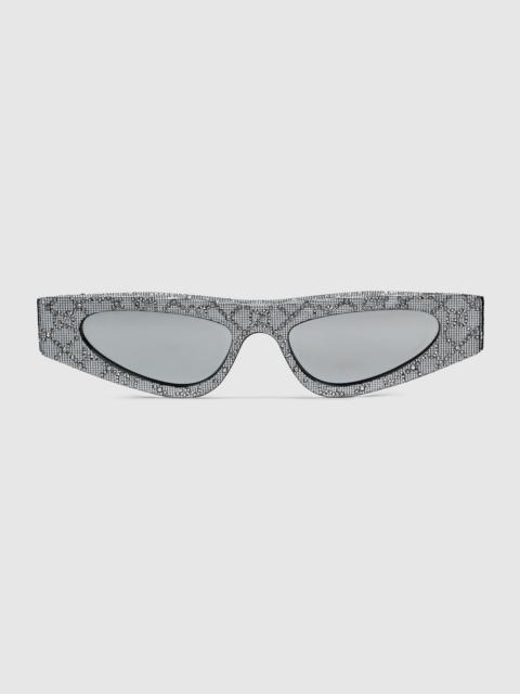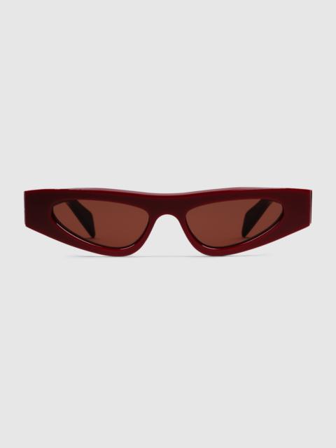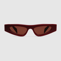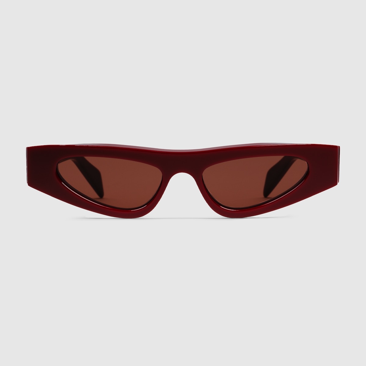 The eyewear collection puts a twist on the iconic Gucci signature silhouettes. In this cat-eye frame sunglasses, a subtle Gucci logo defines the temples, drawing inspirations from the House motif. - Shiny Gucci Rosso Ancora red acetate frame - Shiny Gucci Rosso Ancora red acetate temples with Gucci logo - Solid brown lens - 100% UVA/UVB protection - GG1779S - Temple length: 5.7"; Lens height: 1"; Nose bridge length: 0.7" - Frame height: 1.3"; Frame width: 5.7" - The Rosso Ancora packaging, a distinctive color chosen by Creative Director Sabato De Sarno to mark the beginning of Gucci's new creative chapter, includes a vinyl case and satin pouch.