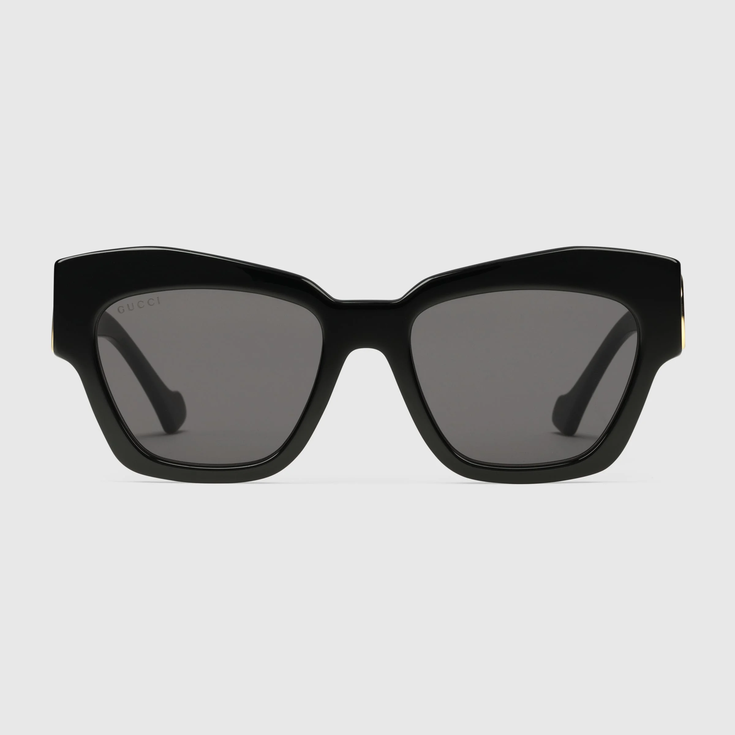 For the Pre-Fall 2023, cat-eye frames add charm to a selection of optical glasses. The signature Double G detail decorates the temples, completing the black acetate frame with grey lens. - Shiny black acetate frame - Shiny black acetate temples with Double G - Solid grey lens - 100% UVA/UVB protection - Frame height: 2.1"; Frame width: 5.8" - GG1422S - Temple length: 5.7"; Lens height: 1.7", Nose bridge length: 0.7" - The glasses will arrive in a velvet case, available in a range of six jewel-toned colors and paired with a coordinating satin lining. The case color will be individually selected for each pair of glasses and comes with a matching satin flannel pouch and ivory microfiber cloth.