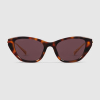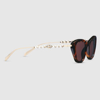 The Pre-Fall 2025 eyewear collection blends statement silhouettes from the archives with a contemporary touch. These cat eye frame sunglasses are stated in medium brown tortoiseshell and light gold-toned metal with pearls and a cut-out Interlocking G. - Shiny medium brown tortoiseshell acetate frames - Shiny light gold-toned metal temples with pearls and cut-out Interlocking G - Solid brown lens - 100% UVA/UVB protection - GG1968S - Temple length: 5.5"; Lens height: 1.4", Nose bridge length: 0.7" - Frame height: 1.6"; Frame width: 5.5"; Hinge to hinge: 5.2" - The glasses will arrive in a velvet case, available in a range of six jewel-toned colors and paired with a coordinating satin lining. The case color will be individually selected for each pair of glasses and comes with a matching satin flannel pouch and ivory microfiber cloth.