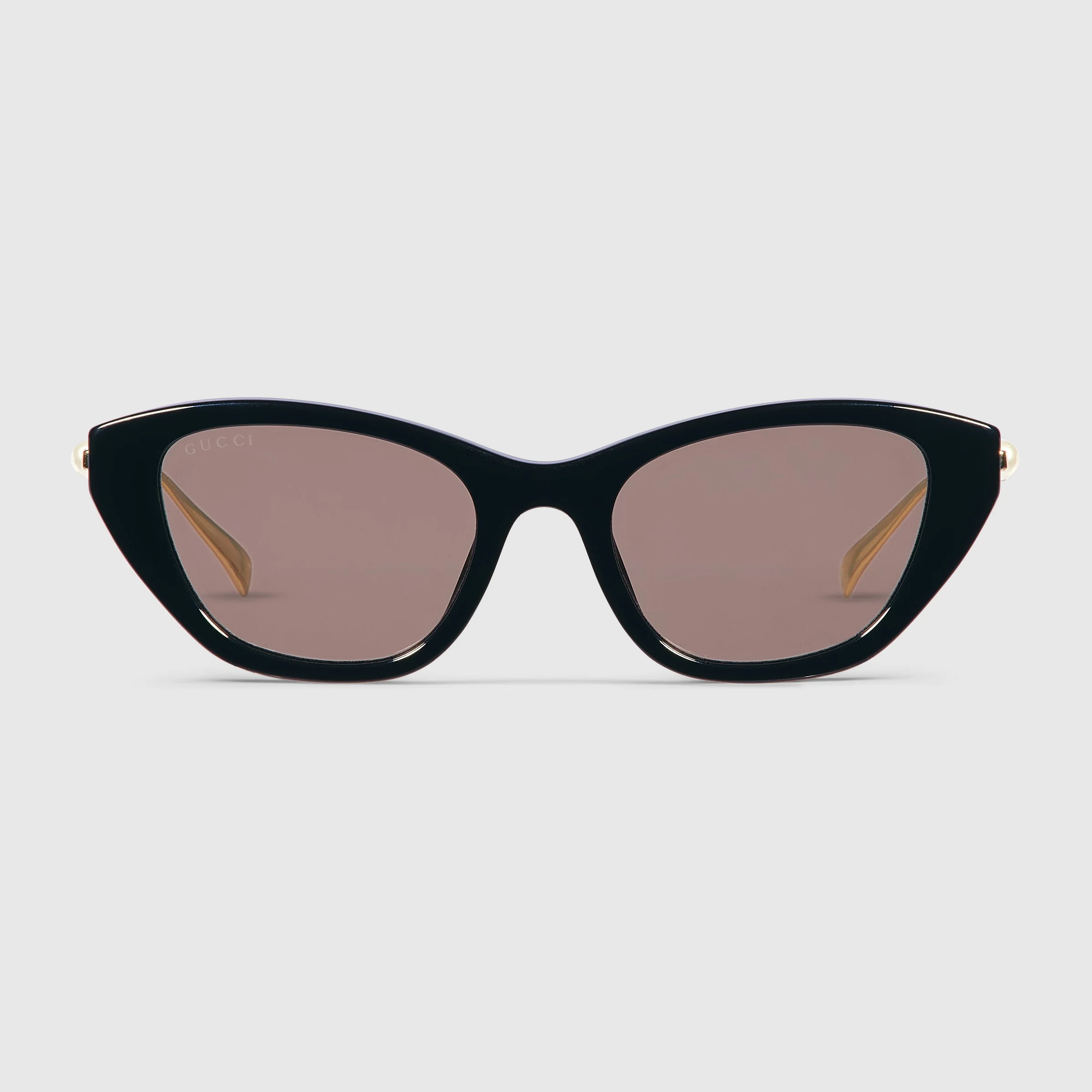 The Pre-Fall 2025 eyewear collection blends statement silhouettes from the archives with a contemporary touch. These cat eye frame sunglasses are stated in black acetate and light gold-toned metal with pearls and a cut-out Interlocking G. - Shiny black acetate frames - Shiny light gold-toned metal temples with pearls and cut-out Interlocking G - Light brown flashy lens - 100% UVA/UVB protection - GG1968S - Temple length: 5.5"; Lens height: 1.4", Nose bridge length: 0.7" - Frame height: 1.6"; Frame width: 5.5"; Hinge to hinge: 5.2" - The glasses will arrive in a velvet case, available in a range of six jewel-toned colors and paired with a coordinating satin lining. The case color will be individually selected for each pair of glasses and comes with a matching satin flannel pouch and ivory microfiber cloth.