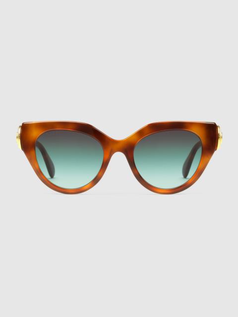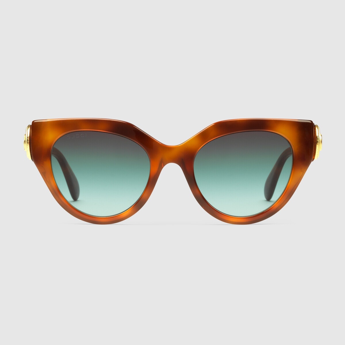 Classic styles are constantly reimagined through a Gucci lens. A delicate, light tortoiseshell acetate frame characterizes this pair of cat-eye frames. The distinctive Double G logo, which first debuted as a belt buckle, now embellishes select eyewear as bold gold-toned detail. - Shiny light tortoiseshell acetate frame - Shiny light tortoiseshell acetate temples with gold-toned metal Double G logo detail - Gradient green lens - 100% UVA/UVB protection - Frame height: 2.2"; Frame width: 5.7" - GG1408S - Temple length: 5.3"; Lens height: 1.8", Nose bridge length: 0.8" - The glasses will arrive in a velvet case, available in a range of six jewel-toned colors and paired with a coordinating satin lining. The case color will be individually selected for each pair of glasses and comes with a matching satin flannel pouch and ivory microfiber cloth.