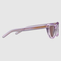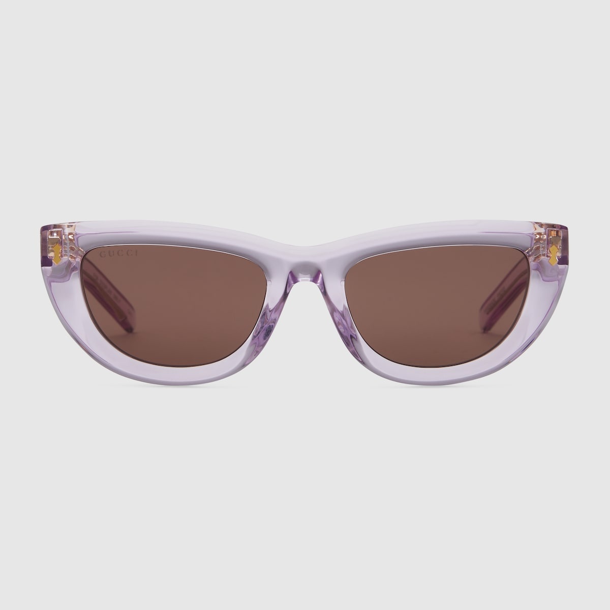 Crafted in shiny transparent light lilac acetate with solid brown lenses, iconic cat-eye frame sunglasses have been reinterpreted in this silhouette, with Gucci logo detail and rivets. - Shiny transparent light lilac acetate frame - Shiny transparent light lilac acetate temples with Gucci logo detail and rivets - Solid brown lens - 100% UVA/UVB protection - Frame height: 1.7"; Frame width: 5.6" - GG1521S - Temple length: 5.5"; Lens height: 1.3", Nose bridge length: 0.8" - Made in Italy - The glasses will arrive in a velvet case, available in a range of six jewel-toned colors, and paired with a coordinating satin lining. The case color will be individually selected for each pair of glasses, and comes with a matching satin flannel pouch and ivory microfiber cloth.