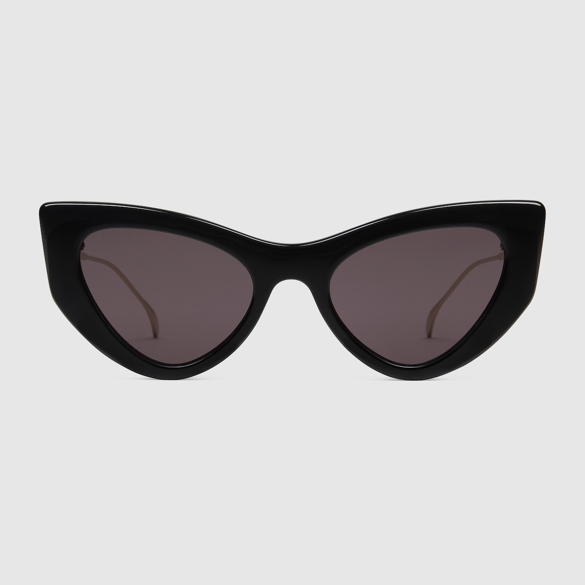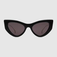 For Cruise 2024, the eyewear selection is defined by archival silhouettes reinterpreted with a contemporary touch. Here, a black cat-eye injection frame is decorated with a Double G cut-out detail on the temples. - Shiny black injection frame - Shiny gold-toned metal temples with cut-out Double G - Solid grey lens - 100% UVA/UVB protection - Frame height: 2"; Frame Width: 5.7" - GG1565S - Temple length: 4.7"; Lens height: 1.6", Nose bridge length: 0.8" - Made in Japan - The glasses will arrive in a velvet case, available in a range of six jewel-toned colors and paired with a coordinating satin lining. The case color will be individually selected for each pair of glasses and comes with a matching satin flannel pouch and ivory microfiber cloth.