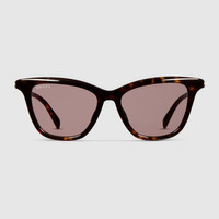The House's eyewear collection continues to reinterpret emblematic motifs, from the GG, Web, bamboo, Horsebit and equestrian inspirations, in sumptuous materials, intricate craftsmanship, and fresh hues. These cat-eye sunglasses are stated in dark brown tortoiseshell acetate with a Gucci logo across the temples. - Shiny dark brown tortoiseshell acetate frame - Shiny dark brown tortoiseshell acetate temples with Gucci logo - Brown lens - 100% UVA/UVB protection - GG2032S - Temple length: 5.5"; Lens height: 1.6"; Nose bridge length: 0.6" - Frame height: 5.6"; Frame width: 1.8"; Hinge to hinge: 5" - The eyewear case in the House’s signature Rosso Ancora red hue is complete with a magnetic closure and white interior