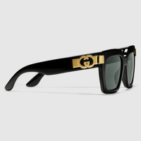 The Pre-Fall 2024 eyewear collection successfully combines the coveted silhouettes of bygone decades with a contemporary logo feel. Here, a shiny black injection frame pairs with an Interlocking G motif. - Shiny black injection frames - Shiny black injection temples with Interlocking G - Solid grey lens - 100% UVA/UVB protection - GG1689S - Temple length: 5.7"; Lens height: 1.6", Nose bridge length: 0.7" - Frame height: 2.1"; Frame width: 5.9" - Made in Italy - The Rosso Ancora packaging, a distinctive color chosen by Creative Director Sabato De Sarno to mark the beginning of Gucci's new creative chapter, includes a vinyl case and satin pouch.