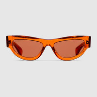 The Pre-Fall 2025 eyewear collection presents the Guccissima motif in a bold hue and silhouette. These cat eye sunglasses are stated in acetate with an allover GG motif. A solid burnt orange lens completes the silhouette. - Shiny transparent orange acetate frame with engraved allover GG motif - Shiny transparent orange acetate temples with engraved allover GG motif - Solid burnt orange lens - 100% UVA/UVB protection - GG1834S - Temple length: 5.7"; Lens height: 1.2"; Nose bridge length: 0.6" - Frame height 1.6"; Frame width 5.6"; Hinge to hinge 5.1" - Made in Italy - The eyewear case in the House’s signature Gucci Rosso Ancora red hue is complete with a magnetic closure and white interior.