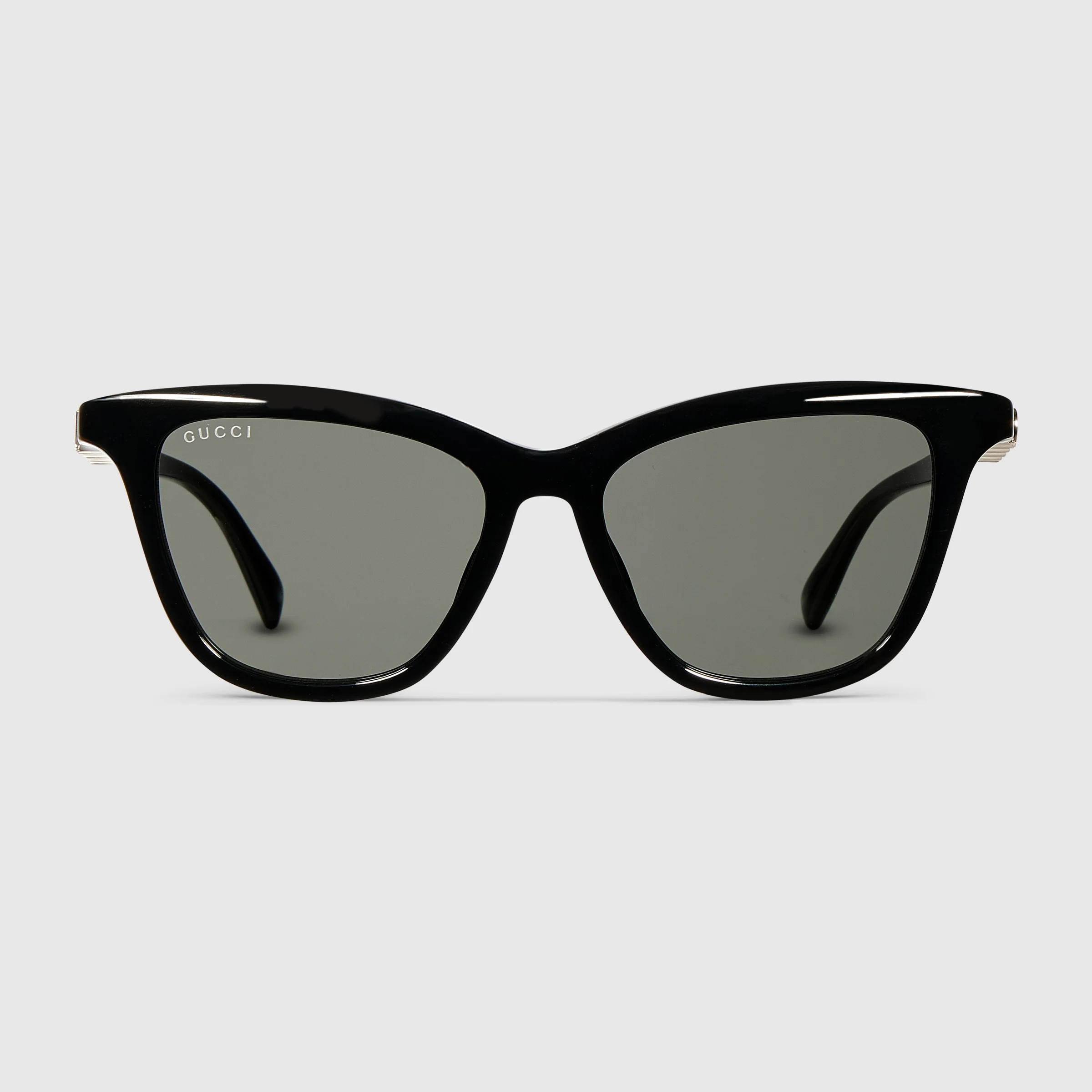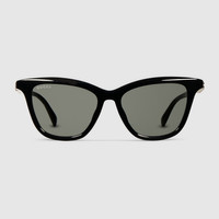 The House's eyewear collection continues to reinterpret emblematic motifs, from the GG, Web, bamboo, Horsebit and equestrian inspirations, in sumptuous materials, intricate craftsmanship, and fresh hues. These cat-eye sunglasses are stated in black acetate with a Gucci logo across the temples. - Shiny black acetate frames - Shiny black acetate temples with Gucci logo - Grey lens - 100% UVA/UVB protection - GG2032S - Temple length: 5.5"; Lens height: 1.6"; Nose bridge length: 0.6" - Frame height: 5.6"; Frame width: 1.8"; Hinge to hinge: 5" - The eyewear case in the House’s signature Rosso Ancora red hue is complete with a magnetic closure and white interior