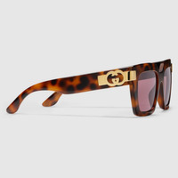 The Pre-Fall 2024 eyewear collection successfully combines the coveted silhouettes of bygone decades with a contemporary logo feel. Here, a shiny tortoiseshell injection frame pairs with an Interlocking G motif. - Shiny tortoiseshell injection frames - Shiny tortoiseshell injection temples with Interlocking G - Solid bordeaux lens - 100% UVA/UVB protection - GG1689S - Temple length: 5.7"; Lens height: 1.6", Nose bridge length: 0.7" - Frame height: 2.1"; Frame width: 5.9" - Made in Italy - The Rosso Ancora packaging, a distinctive color chosen by Creative Director Sabato De Sarno to mark the beginning of Gucci's new creative chapter, includes a vinyl case and satin pouch.