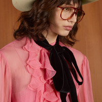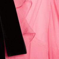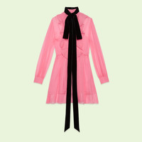 Taking shape with a '70s inspired silhouette, this chiffon ruffle dress features a front self-tie neck bow and flounces at the bottom. Imbued with romantic elements, see-through fabric appears throughout the collection as a portrayal of self-expression. - Pink chiffon creponne - Bow and ruffle details - Detachable lining - Long sleeve - Cinched waist - Back zip closure - Length: 22.8", based on a size 40 (IT) - Made in Italy - The product in this image is a size 40 (IT)