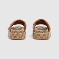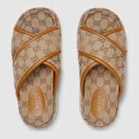 Emblematic codes of the House and refined patterns are reinterpreted in contemporary ways for the latest Gucci collection. This wedge sandal is crafted in GG canvas and is defined by the signature silhouette. - Beige and dark brown Original GG canvas - Women's - Leather trim - Leather lining - Rubber sole - Low heel - Height: 1.1" - Made in Italy