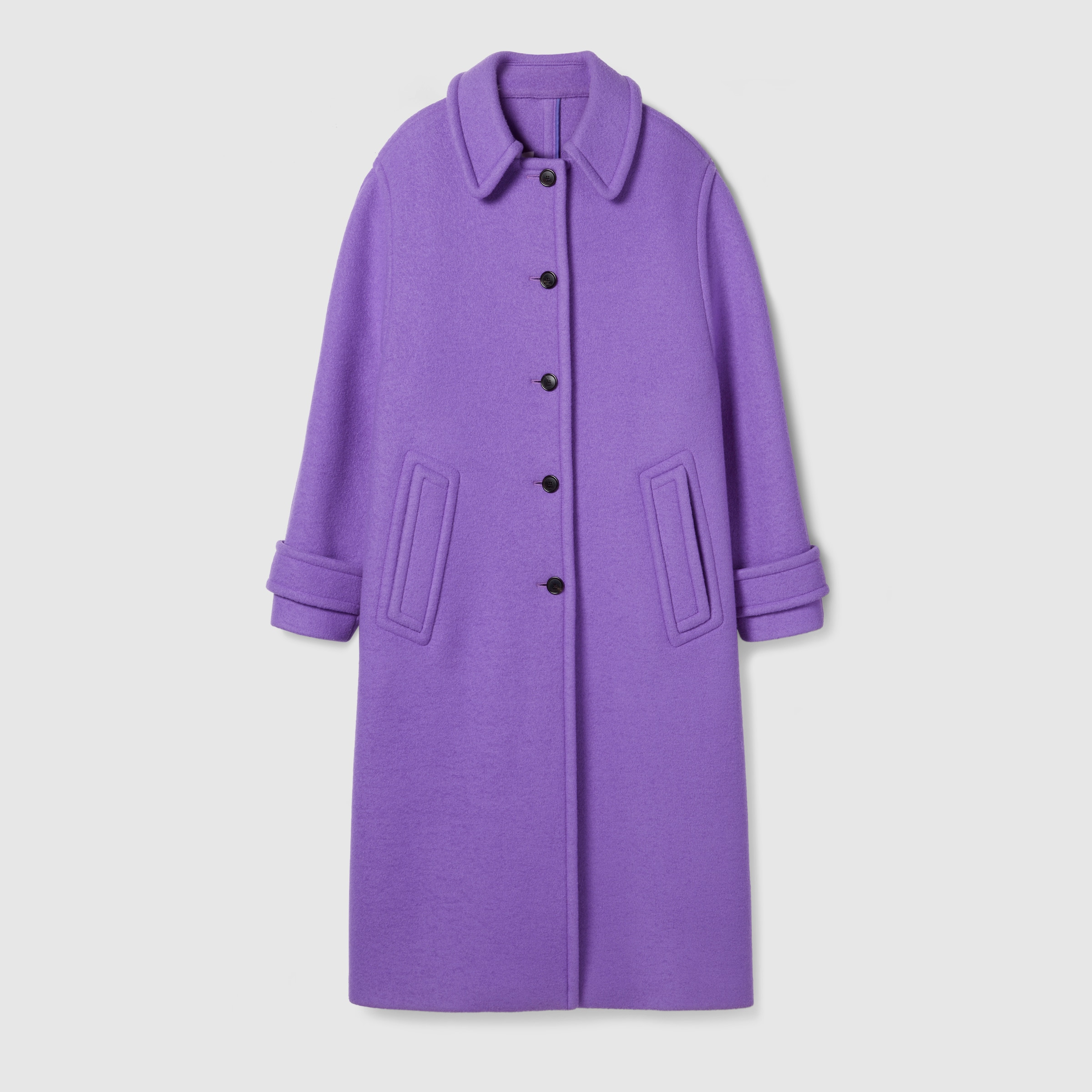 In the Fall Winter 2025 collection, classic outerwear is elevated through a refined construction. This coat features a pointed collar, button-up front and finished with a half lining for a lighter feel. - Purple compact wool cashmere - Half lined - Point collar - Long sleeves with tab cuffs - Front welt pockets - Button closure - Length: 49.2"; based on size 44 IT - Made in Italy