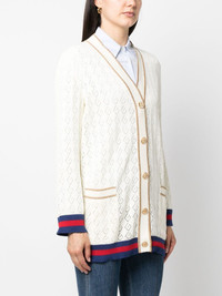 G-monogram pointelle cotton cardigan Highlights - Ivory white - Bright red - Navy blue - Cotton - Pointelle knit - Metallic threading - Front button fastening - Long sleeves - Striped edge - Ribbed cuffs and hem - Straight hem Made in Italy Composition Cotton 100%