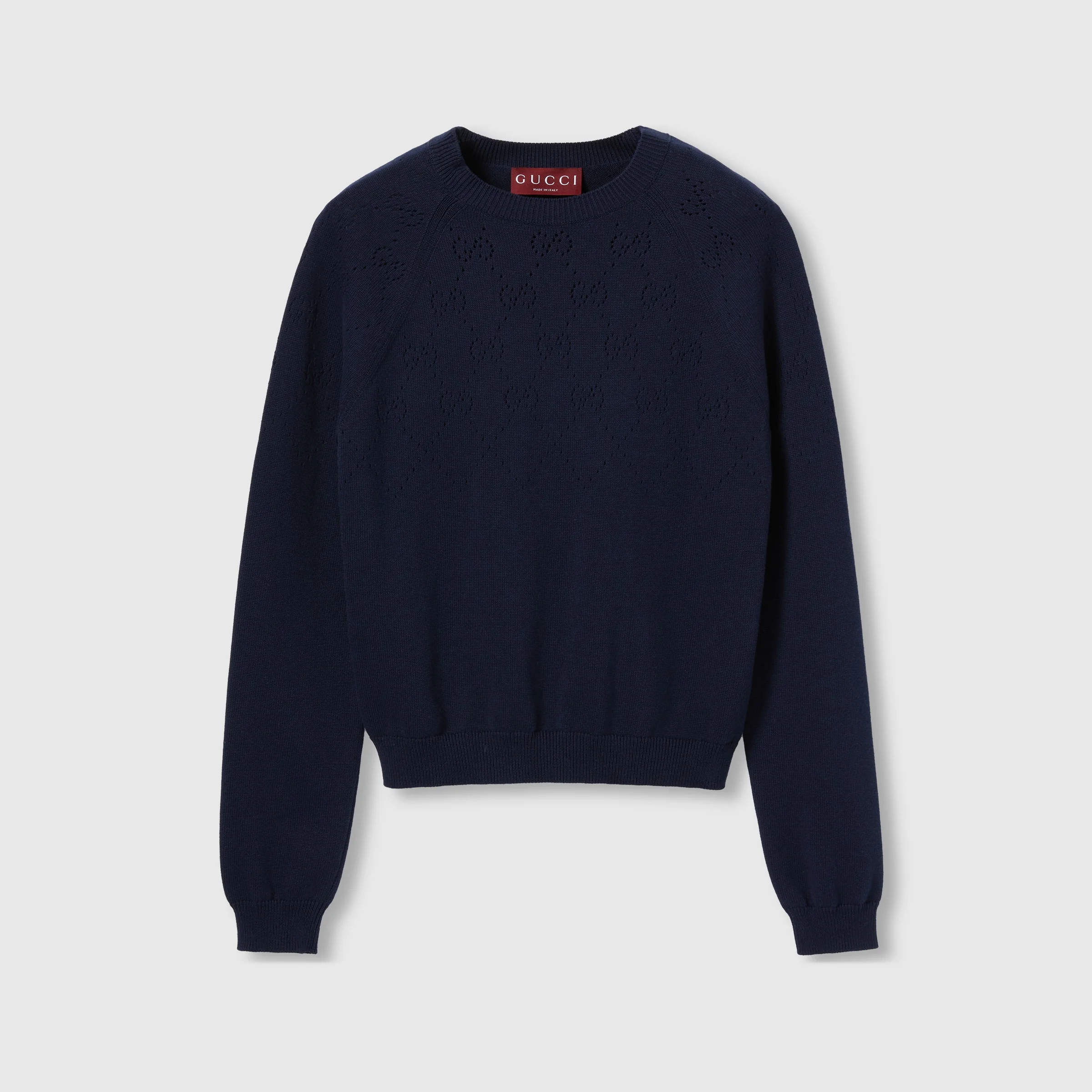 The GG monogram reinterprets the House’s history of elegance and craftsmanship. This crewneck top is presented in a navy cotton with an allover GG argyle detail. - Navy cotton - GG argyle detail - Crewneck - Long raglan sleeves - Rib trim - Length: 21.3"; Half waist/chest: 17.3"; Sleeves length: 26" based on a size xs - Made in Italy - The model is 5'8" and is wearing size small