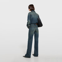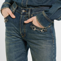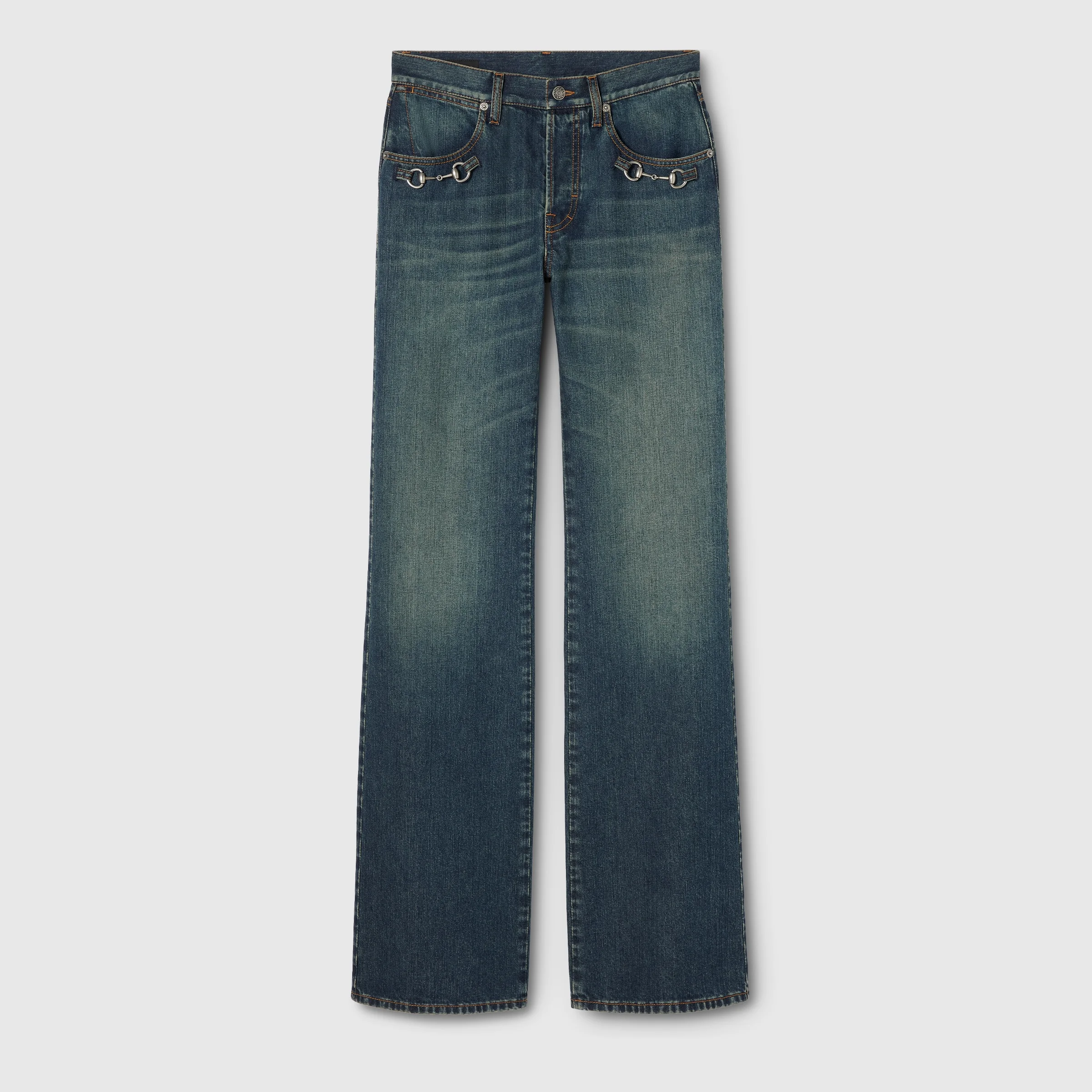 Introducing Spring Summer 2026. This style is part of the La Famiglia collection, which reinterprets the House’s codes through singular personalities and distinctive aesthetic attitudes. Crafted from bleached certified cotton denim, this pair of pants is defined by an Horsebit detail. - Blue washed bleached certified cotton denim - Horsebit detail - Embossed Gucci made in Italy leather label - Belt loops - Side and back pockets - Zip and button closure - Low rise boot cut - Length: 46.3", Leg opening: 20.9", based on a size 25 - Made in Italy - Label: Calfskin - Fabric: 100% Cotton - Pocket lining: 65% Polyester, 35% Cotton