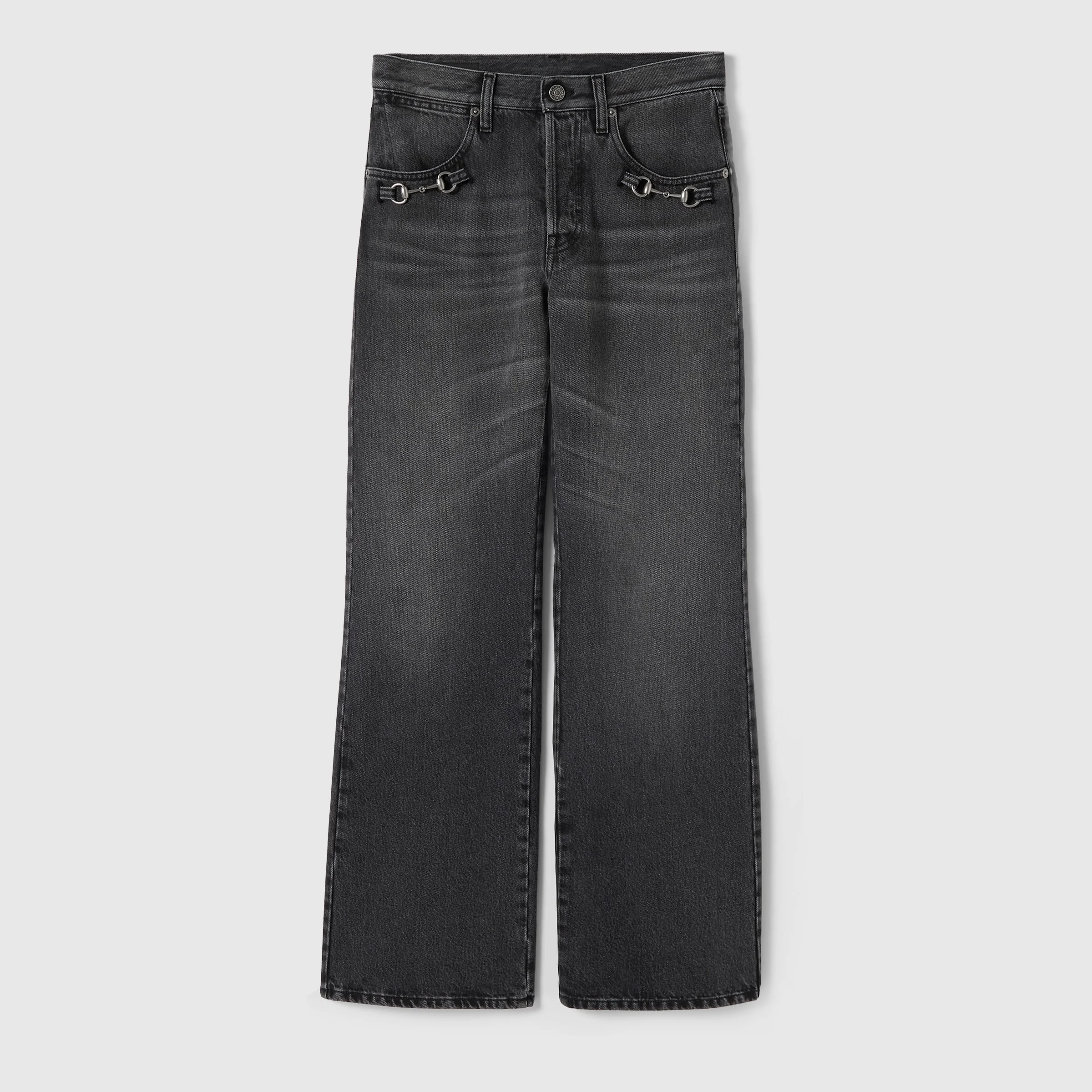 Introducing Spring Summer 2026. This style is part of the La Famiglia collection, which reinterprets the House’s codes through singular personalities and distinctive aesthetic attitudes. Crafted stone bleached washed certified cotton denim, these pants are enriched with a Horsebit detail. - Dark grey stone bleached washed certified cotton denim - Horsebit detail - Embossed Gucci made in Italy leather label - Belt loops - Side and back pockets - Button and zip fly closure - Low rise boot cut petite - Length: 42.4"; Leg opening: 20.9", based on a size 25 - Made in Italy - Label: Calfskin - Fabric: 100% Cotton - Pocket lining: 65% Polyester, 35% Cotton