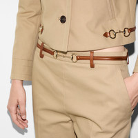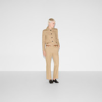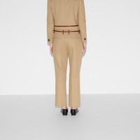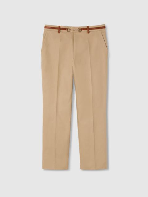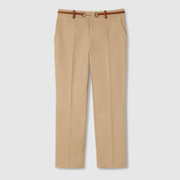 Classics such as elegant shirts and tailored pants throughout the Cruise 2025 collection stand out with subtle details that elevate everyday looks. This refined pair of pants are presented in a beige cotton drill and reveal a leather belt with a Horsebit buckle. - Beige cotton drill - Brown leather trim - Lined - Belt loops - Leather belt with Horsebit buckle - Two side pockets - Two back pockets - Pleated - Hidden zip closure - Total length: 36.4"; Total waist: 29.9"; Total hips: 37.4"; Total hem width: 16.3"; based on a size 38 IT - Made in Italy - The product shown in this image is a size 38 (IT)