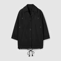 In the Spring Summer 2025 collection, precise silhouettes are crafted in sophisticated materials. This cotton gabardine bomber jacket has a drawstring hem for styling. - Black heavy cotton gabardine - Embossed Gucci logo - Crease details - Unlined - Point collar - Dropped shoulder - Long sleeves - Button closure - Length: 30" based on a size 40 (IT); Sleeve length: 29.5" - Made in Italy - The model is 5'8" and is wearing size 40 (IT)
