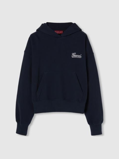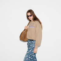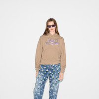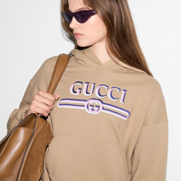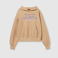 Gucci's House codes continue to evolve for the new season across relaxed jersey pieces. This regular fit hooded sweatshirt is presented in a brushed cotton and defined by a Gucci Interlocking G and Web print. - Camel brushed cotton - Gucci Interlocking G and Web print - Fixed hood - Dropped shoulder - Kangaroo pocket - Rib trim - Regular fit - Length: 20.7"; Shoulder: 23.6"; Half chest: 23.6"; Sleeves length: 33.9" based on a size S - Made in Italy - The product shown in this image is a size small