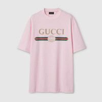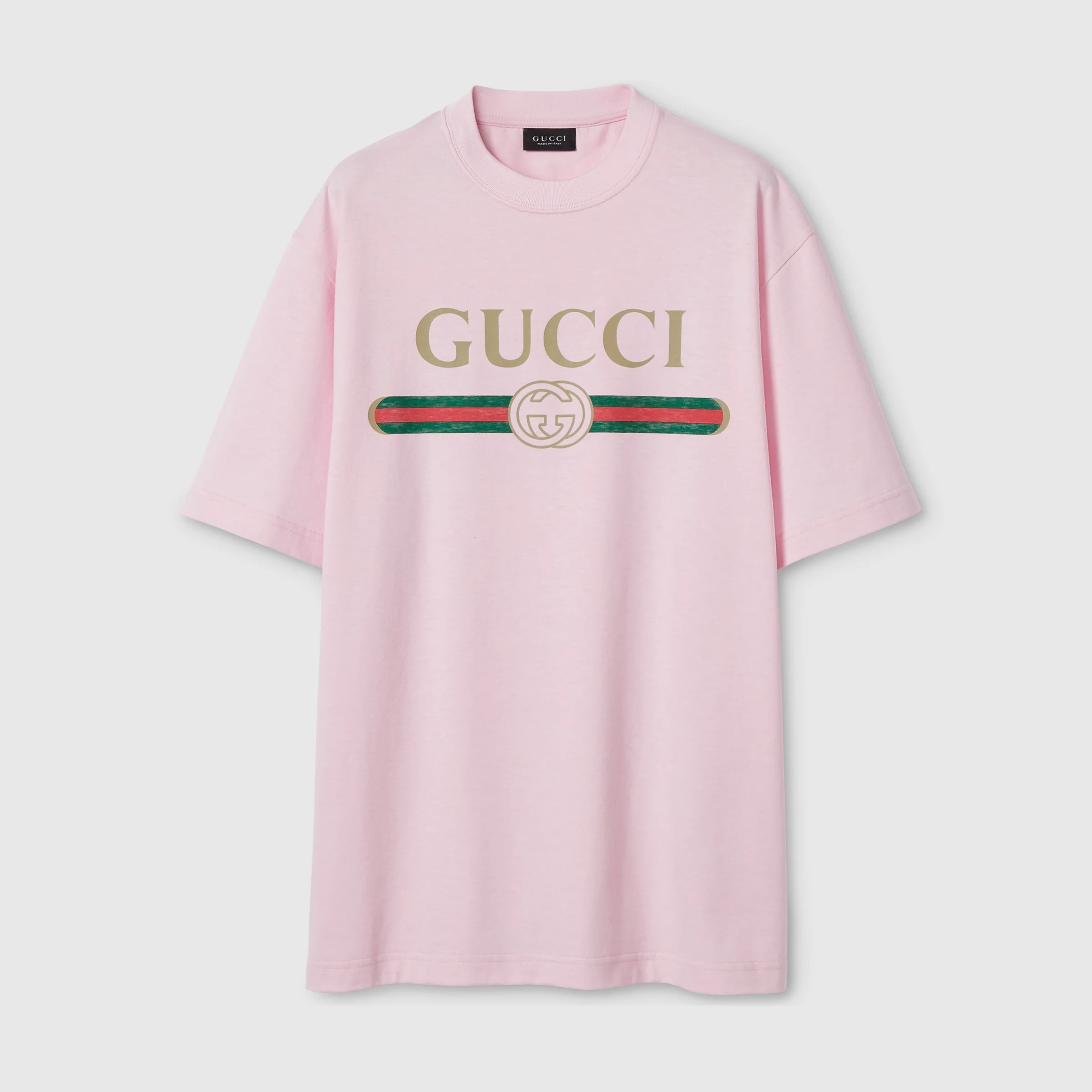Introducing Spring Summer 2026. This style is part of the La Famiglia collection, which reinterprets the House’s codes through singular personalities and distinctive aesthetic attitudes. Crafted from cotton jersey and silk, this T-shirt is is defined by a Gucci Web with Interlocking G print. - Light pink cotton jersey and silk - Gucci Web with Interlocking G print - Crewneck - Short sleeves - Length: 28.1", based o a size S - Made in Italy - Fabric: 80% Cotton, 20% Silk - Trimming: 100% Cotton