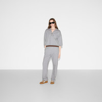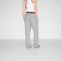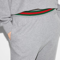 Gucci's House codes continue to evolve for the new season across relaxed jersey pieces. Crafted from a cotton jersey blend, these jogging pants reveal a Gucci logo patch and are further enriched by a green and red Web trim. - Grey cotton jersey blend - Gucci logo patch - Elastic waistband with drawstring - Two side pockets - Web trim - Length: 45.2"; based on a size S - Made in Italy - The model is 5'9" and is wearing size small
