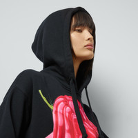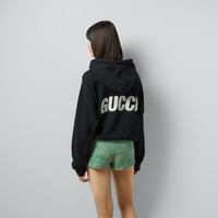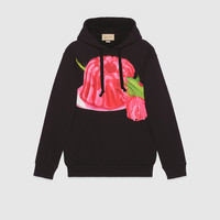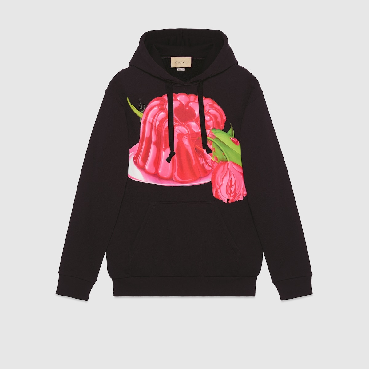 A relaxed attitude speaks volume as casual pieces become indispensable. Sweatshirts, hoodies, and t-shirts with drop shoulders, cropped lengths, and generous fits are adorned with signature embellishments. This off-duty hooded sweatshirt is enriched with a jelly with rose print on the front, and a Gucci embroidery on the reverse. - Black heavy felted cotton jersey - Jelly with rose print - Gucci embroidery - Fixed hood with drawstring - Dropped shoulder - Long sleeves - Kangaroo pocket - Rib trim - Length: 27.3" based on a size medium (IT) - Made in Italy - The product shown in this image is a size medium