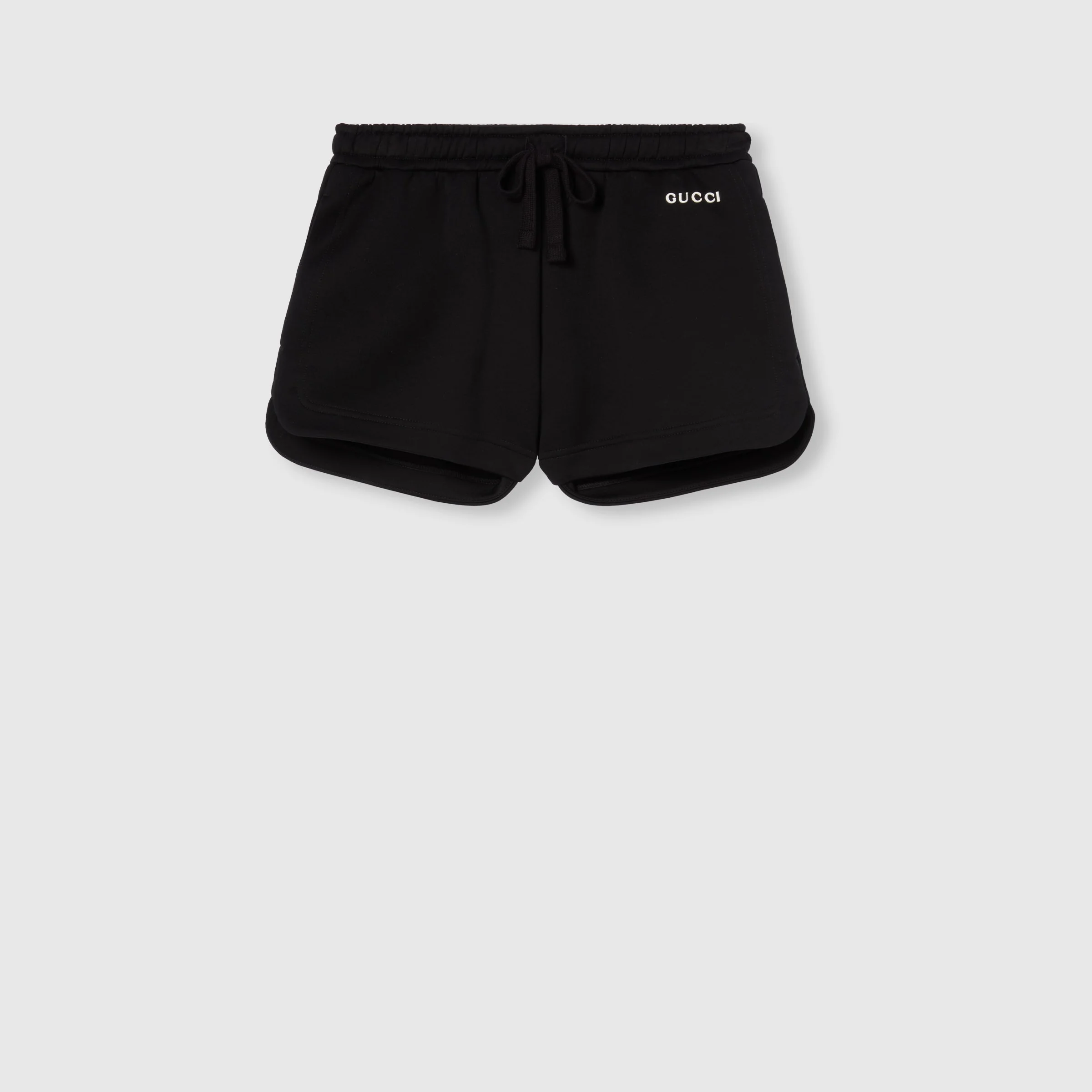 Signature styles have been re-envisioned in unexpected versions, juxtaposed with new details on tops, oversized shirts and leisurewear ensembles. This pair of shorts is made from a light cotton double jersey and enriched with a Gucci metal detail. Can be paired with the matching hooded sweatshirt. - Black light cotton double jersey - Gucci metal detail - Elastic waist with drawstring - Made in Italy