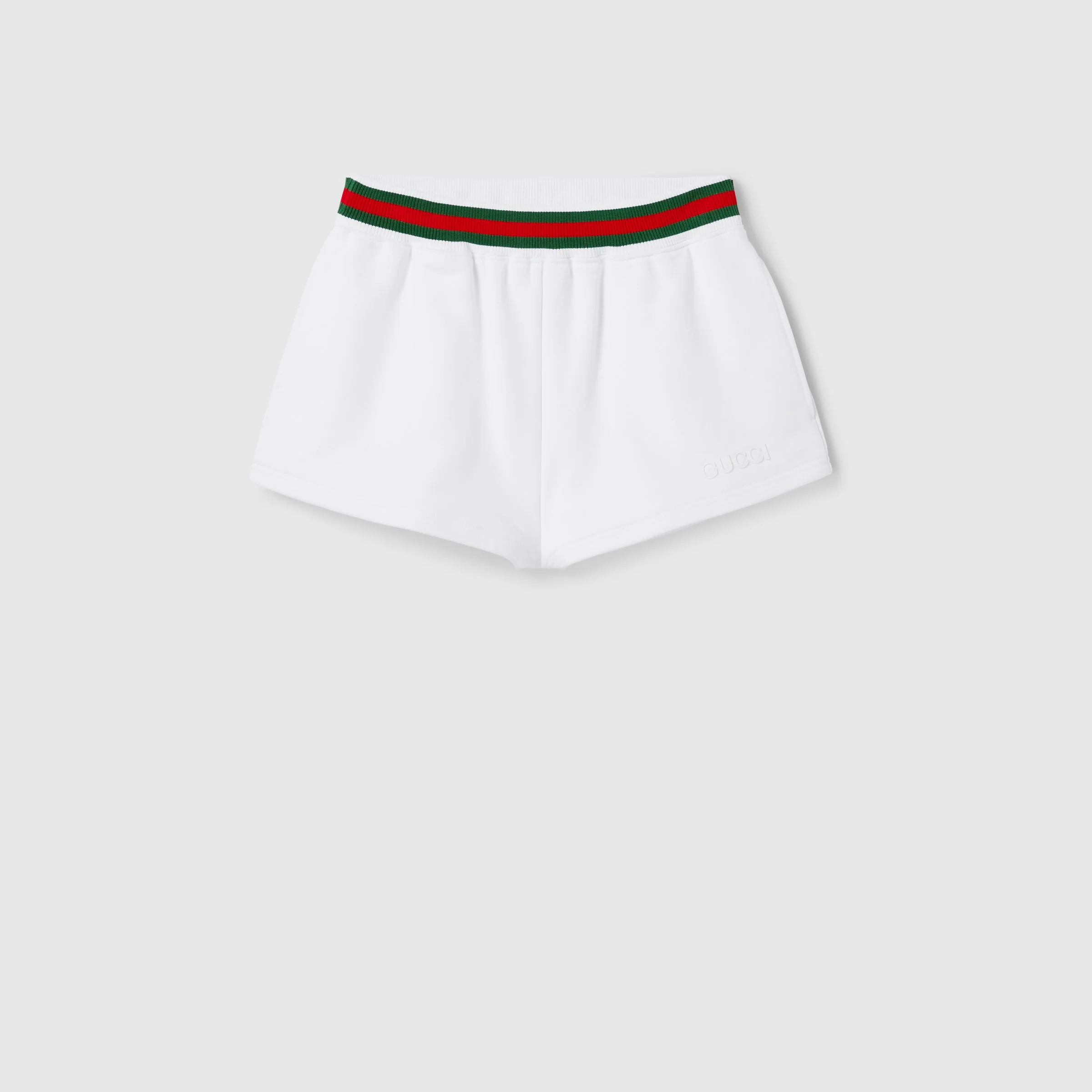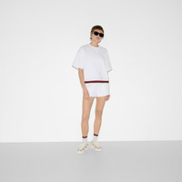 Gucci's House codes continue to evolve for the new season across relaxed jersey pieces. Crafted from a cotton jersey, these shorts reveal a Gucci logo patch and are further enriched by a green and red Web trim. - White cotton jersey - Green and red Web trim - Embroidered Gucci logo patch - Elastic waist with drawstring - Two side pockets - Half waist: 13"; Half hips: 19.9"; Half hem width: 12.6" based on a size xs - Made in Italy - The product shown in this image is a size extra small