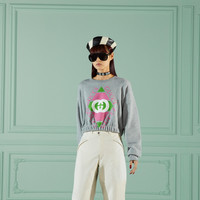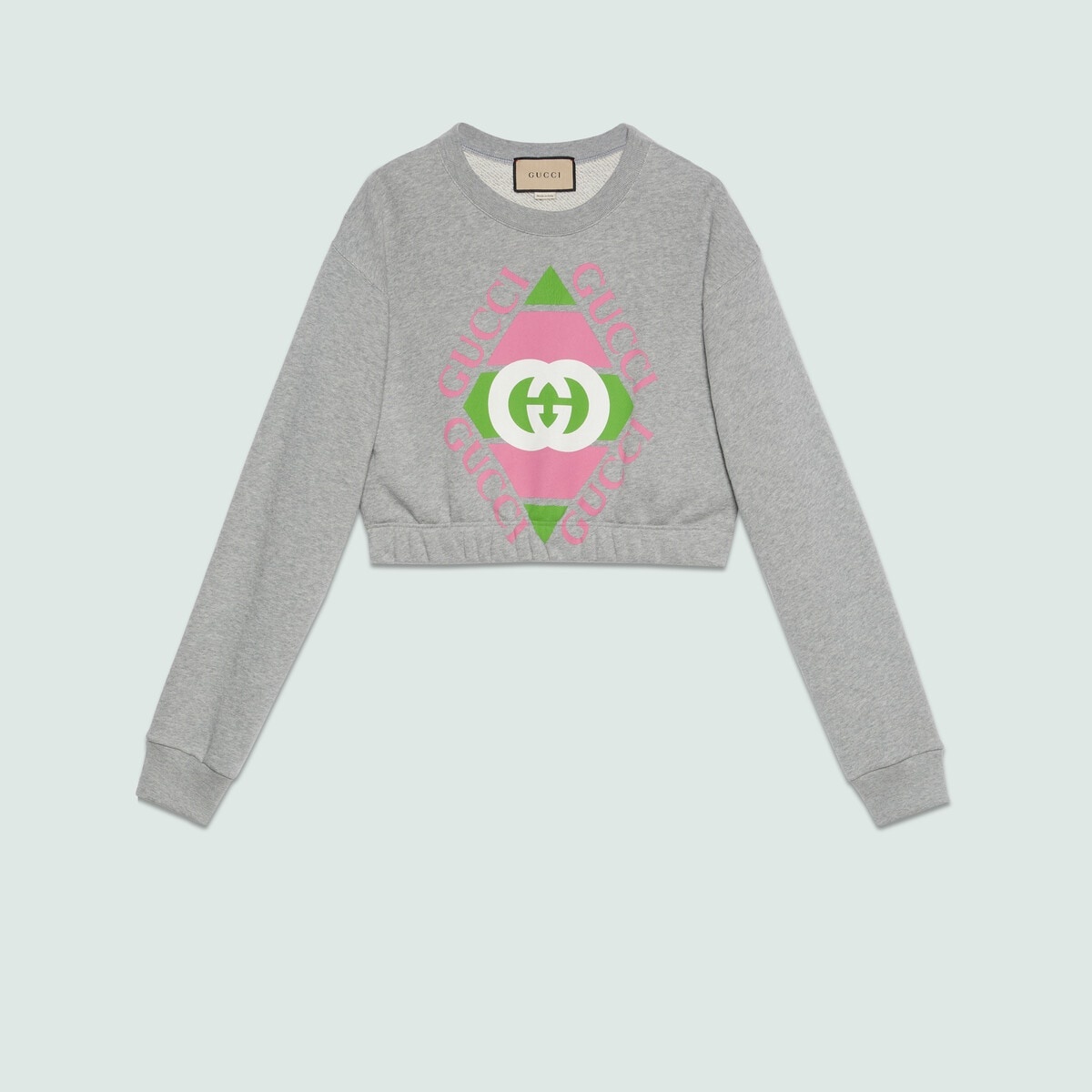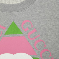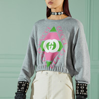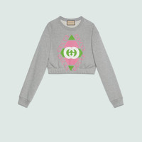 The Gucci vintage logo was inspired by prints from the eighties. The retro-style motif is presented with a new rhombus shape as part of Exquisite Gucci, appearing here atop this grey heavy felted cotton jersey sweatshirt. A rib trim completes the design. - Grey heavy felted cotton jersey - Rib trim - Rhombus Gucci vintage logo print - Crewneck - Long sleeves - Made in Italy - The model is 5'7" and is wearing size medium