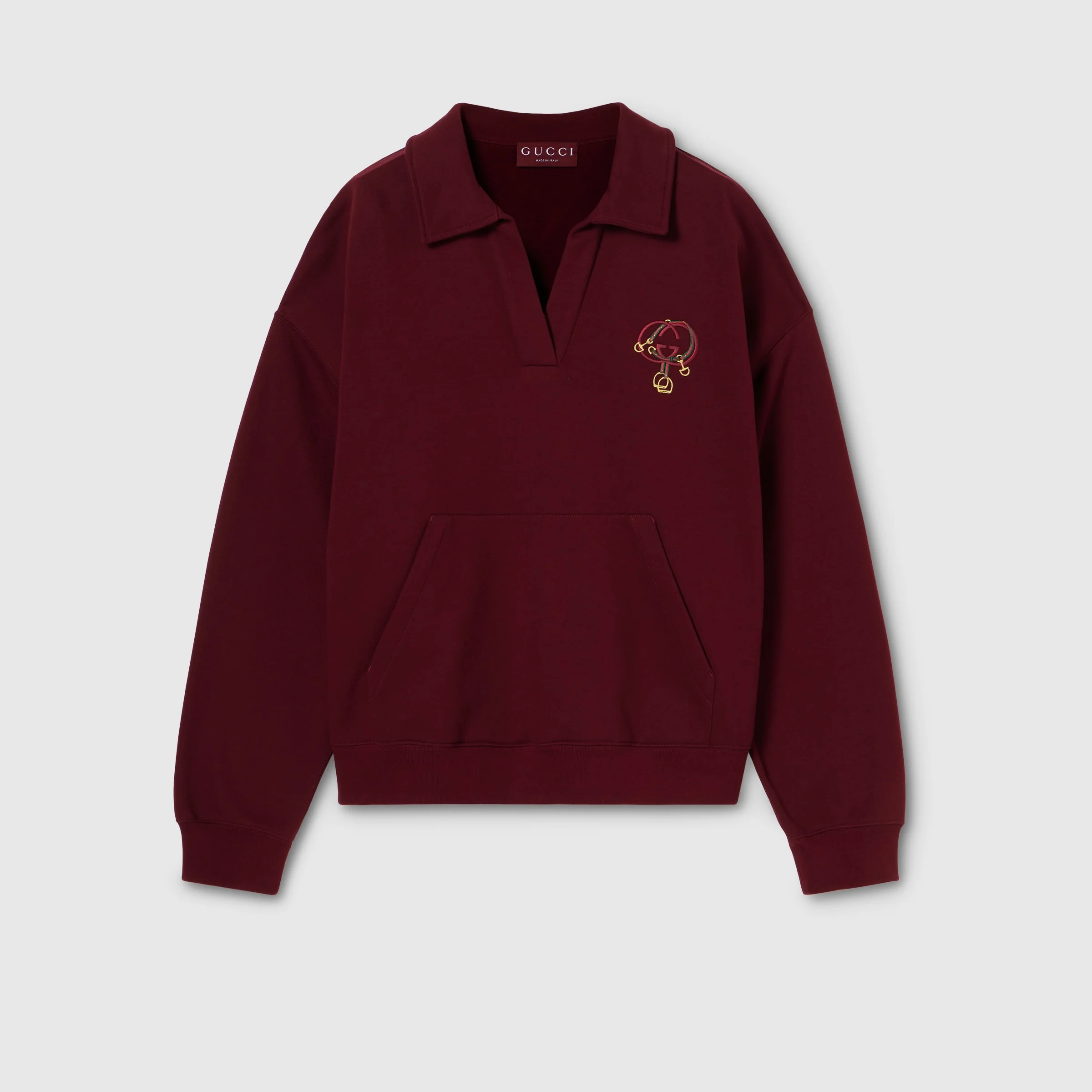 Equestrian symbols embellish signature silhouettes with a vibrant touch. Crafted from cotton jersey, this sweatshirt is defined by a Web Interlocking G and stirrup embroidery. - Gucci Rosso Ancora red cotton jersey - Web Interlocking G and stirrup embroidery - Open collar - Long sleeves - Kangaroo pocket - Length: 23.8" based on a size S - Fabric: 100% Cotton - Trimming: 98% Cotton, 2% Elastane - Embroidery: 100% Polyester