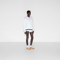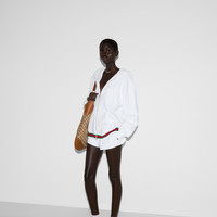 Gucci's House codes continue to evolve for the new season across relaxed jersey pieces. Crafted from a cotton jersey, this oversized sweatshirt reveals a Gucci logo patch and is further enriched by a green and red Web trim. - White cotton jersey - Green and red Web trim - Gucci logo patch - Fixed hood with drawstring - Dropped shoulder - Long sleeves - Kangaroo pocket - Rib trim - Zip closure - Oversize fit - Length: 28.1"; Shoulder: 20.9"; Half chest: 22.8"; Sleeves length: 22.6" based on a size m - Made in Italy - The product shown in this image is a size medium
