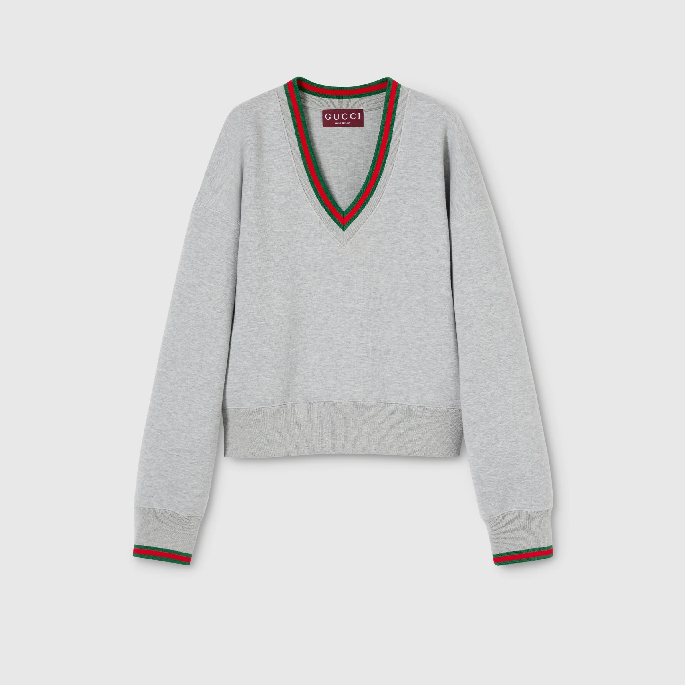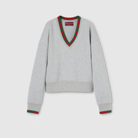 Sportswear-inspired pieces are elevated with the Web detail. The pieces balance comfort and statement, complete with signature house codes. Crafted from cotton jersey, this sweatshirt is completed with a Web trim. - Light grey cotton jersey - Web trim - V-neck - Long sleeves - Length: 21.6" based on a size S