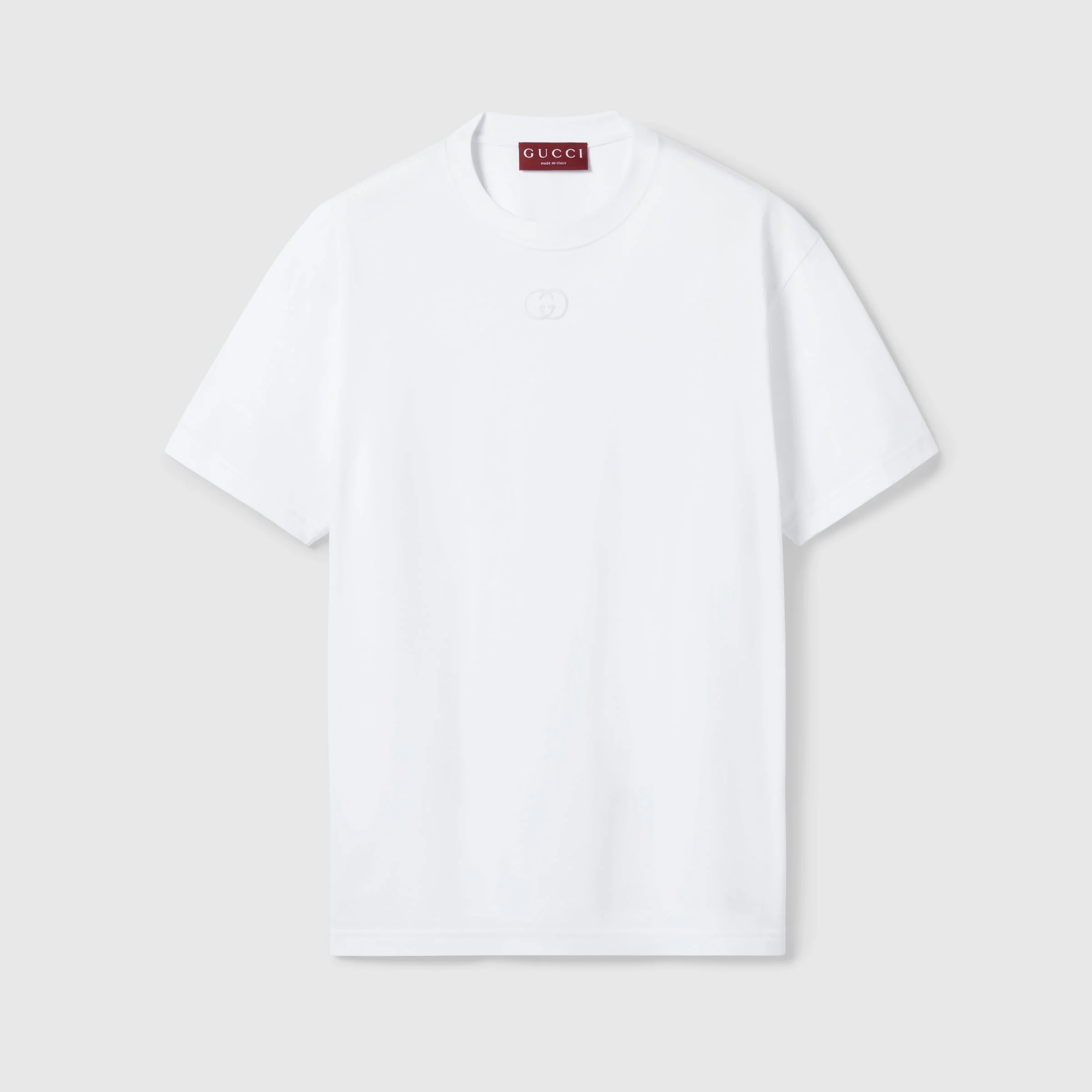 In the Fall Winter 2025 collection, for the Fall Winter 2025 collection, everyday pieces are elevated with prints or embroideries for a casual feel. This T-shirt features an Interlocking G embroidery. - White medium cotton jersey - Interlocking G embroidery - Crewneck - Short sleeves - Regular fit - Made in Italy