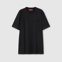 Crystal embellishment is featured in attires that glow from day to night, revisiting signature motifs such as the GG pattern and Horsebit motif. Crafted from black medium cotton jersey, this T-shirt is defined by a Horsebit embroidery embellished with beads. - Black medium cotton jersey - Horsebit embroidery with beads - Crewneck - Short sleeves - Regular fit - Length: 28.1" - Made in Italy