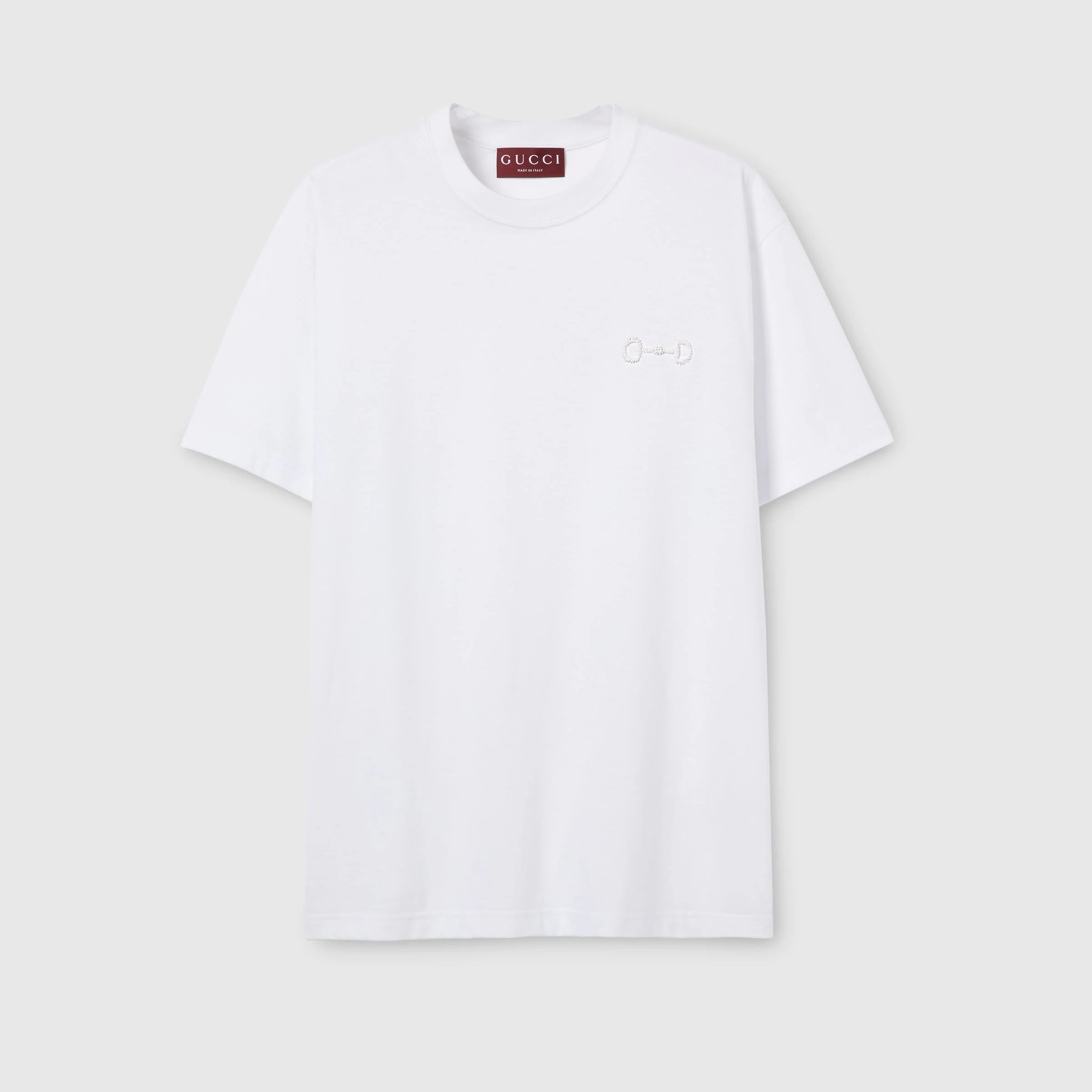 Crystal embellishment is featured in attires that glow from day to night, revisiting signature motifs such as the GG pattern and Horsebit motif. Crafted from white medium cotton jersey, this T-shirt is defined by a Horsebit embroidery embellished with beads. - White medium cotton jersey - Horsebit embroidery with beads - Crewneck - Short sleeves - Regular fit - Length: 28.1" - Made in Italy
