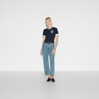 Inspired by the summer spirit and beach clubs on the Italian coast, this item is part of Gucci Lido. Gucci's interpretation of activewear comes through in its Interlocking G logo in the new collection. The subtle motif adorns this navy medium cotton jersey T-shirt, channelling a refined aesthetic. - Navy medium cotton jersey - Gucci Interlocking G 1921 embroidery - Crewneck - Short sleeves - Rib trim - Length: 21.6"; based on a size S - Made in Italy - The product shown in this image is a size small