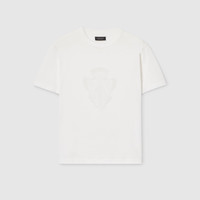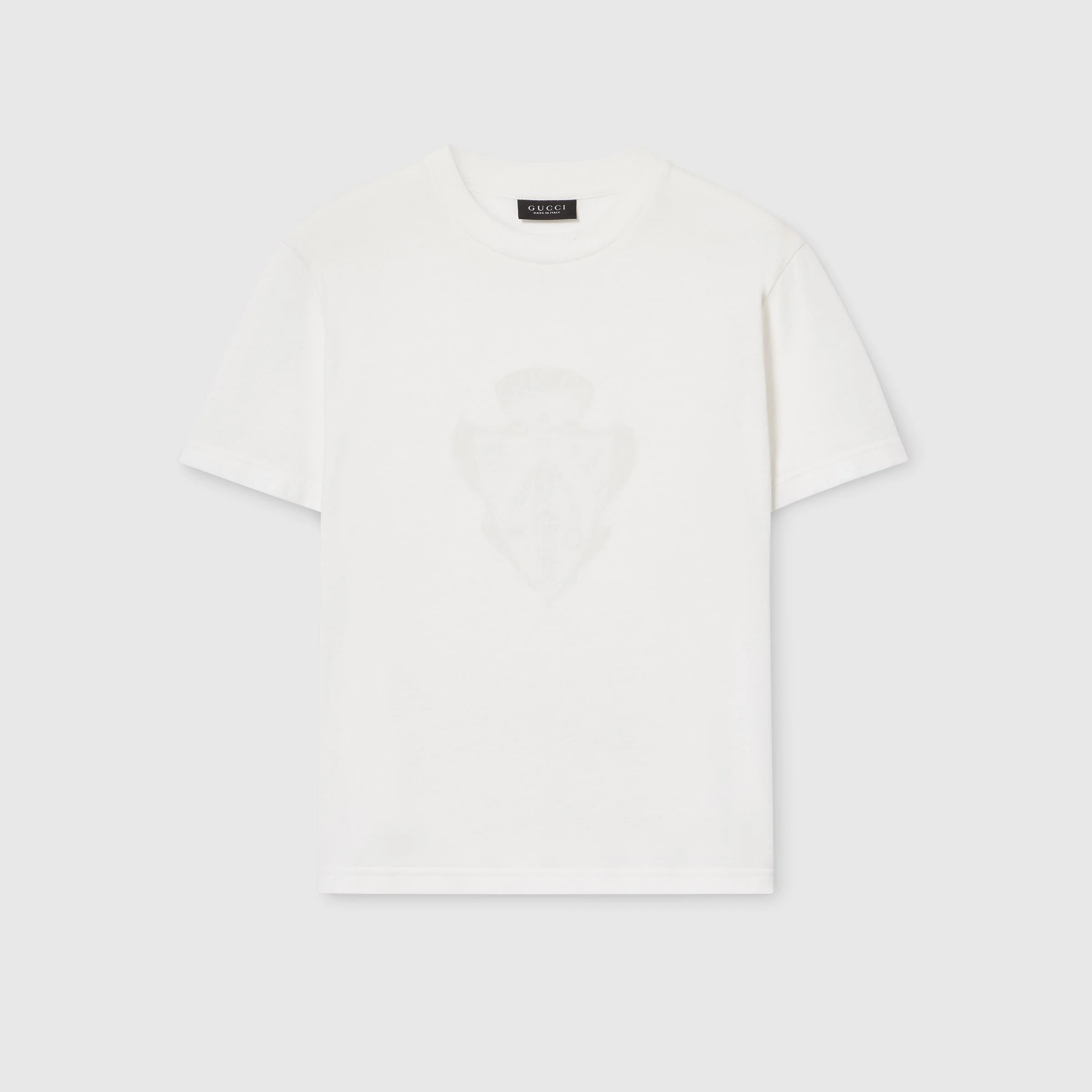 Introducing Spring Summer 2026. This style is part of the La Famiglia collection, which reinterprets the House’s codes through singular personalities and distinctive aesthetic attitudes. Crafted from light cotton jersey, this T-shirt is enriched with a Gucci crest devore detail. - White light cotton jersey - Gucci crest devore detail - Crewneck - Short sleeves - Length: 20.9", based on a size S - Made in Italy - Fabric: 52% Cotton, 48% Polyester