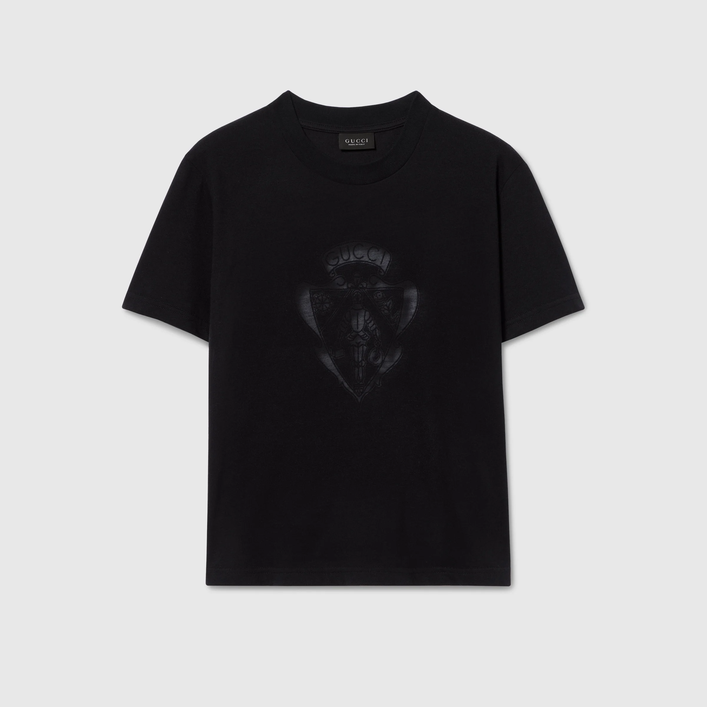 Introducing Spring Summer 2026. This style is part of the La Famiglia collection, which reinterprets the House’s codes through singular personalities and distinctive aesthetic attitudes. Crafted from light cotton jersey, this T-shirt is enriched with a Gucci crest devore detail. - Black light cotton jersey - Gucci crest devore detail - Crewneck - Short sleeves - Length: 20.9", based on a size S - Made in Italy - Fabric: 52% Cotton, 48% Polyester